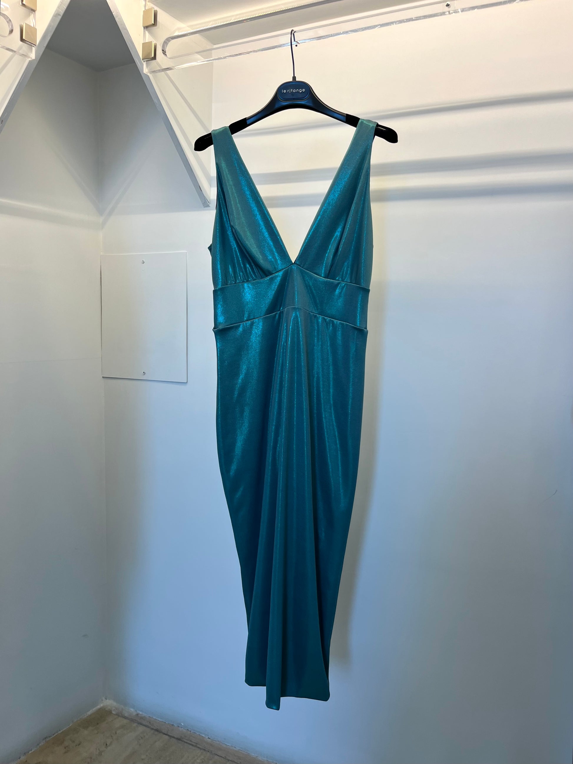 Abito a tubino modello midi con scollo profondo a V. Vestibilità aderente.