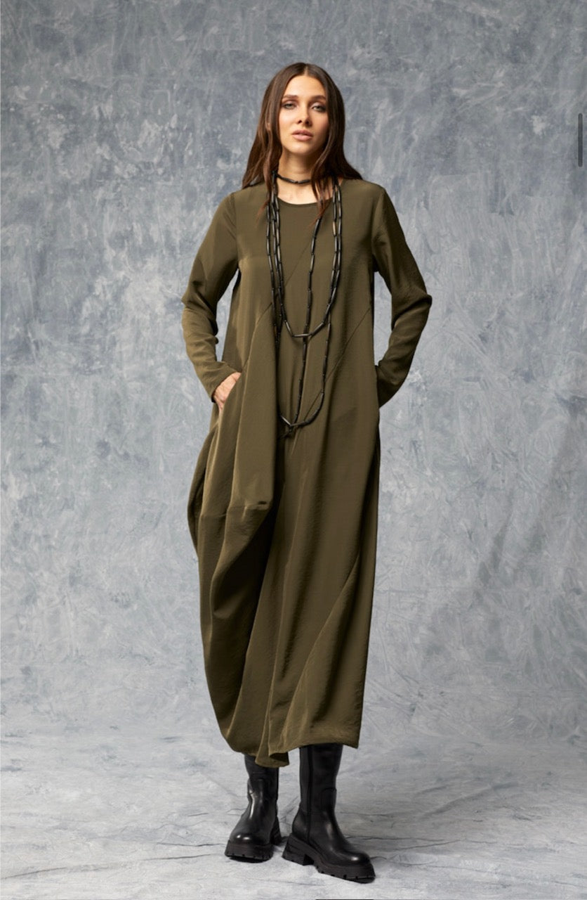 Abito J'm Design. Lunghezza alla caviglia, con gonna ampia ad uovo con tasche. Manica lunga aderente e cuciture sul davanti.