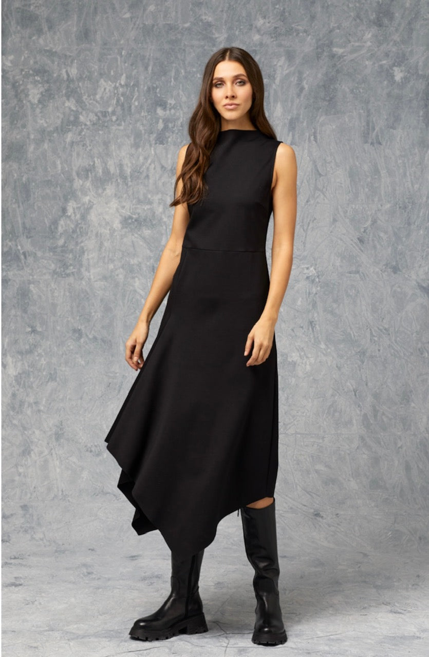 Abito in jersey asimmetrico J'm Design. Collo cratere taglio vivo e giromanica. Aderente sul busto, taglio in vita e gonna leggermente svasata con fondo asimmetrico.