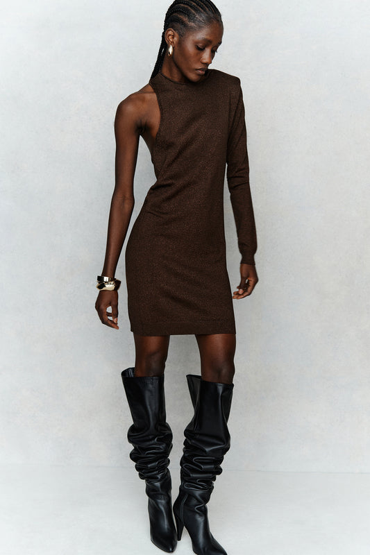 Abito corto in monospalla con schiena scoperta. Mezzo collo e manica lunga. Vestibilità aderente.