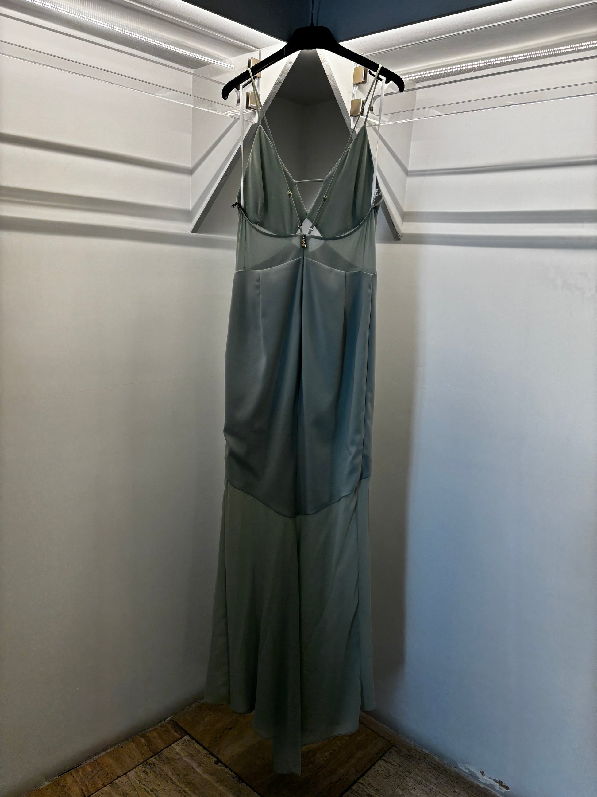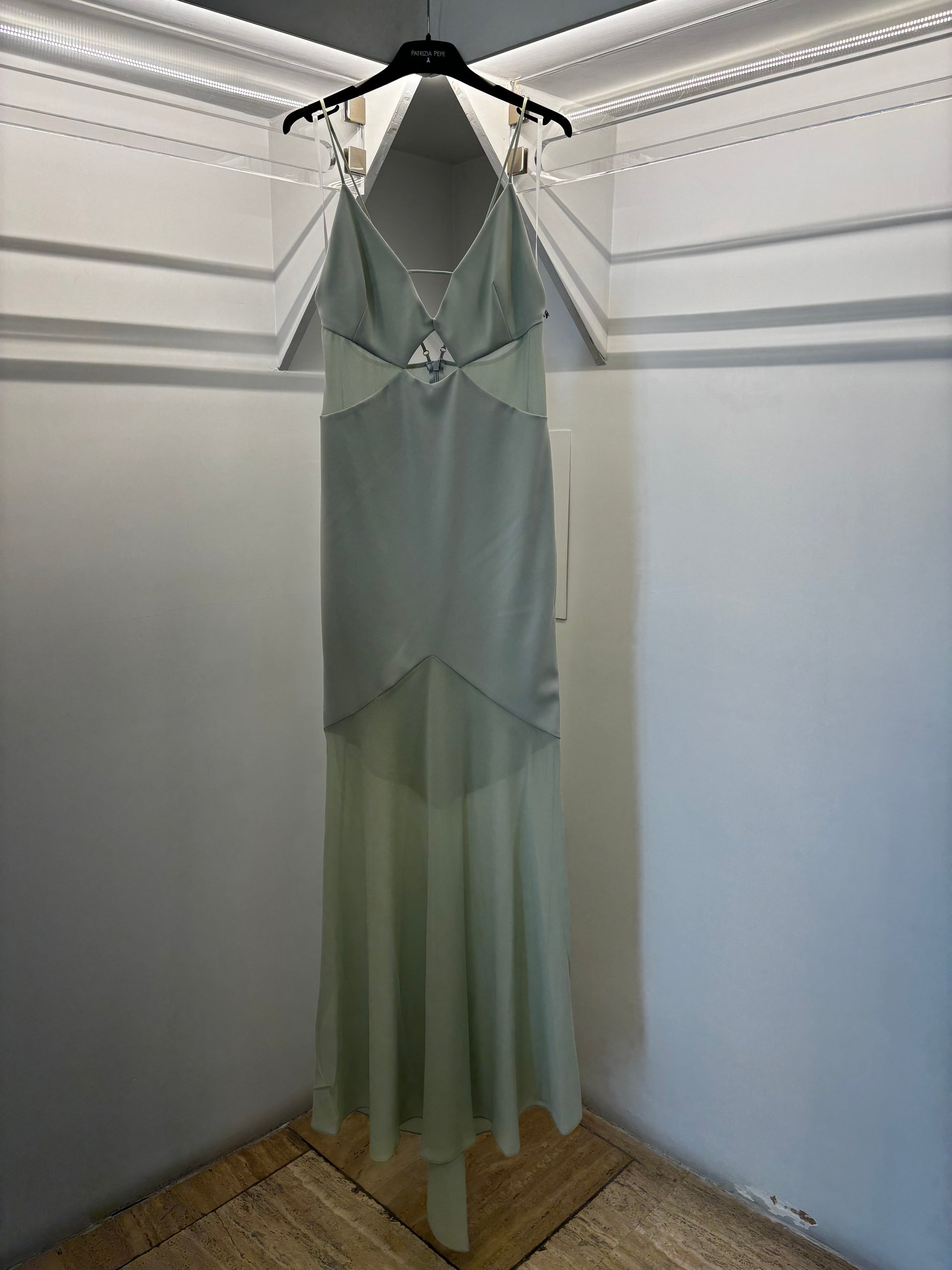 Abito lungo Patrizia Pepe con bretelline e inserti in georgette sui fianchi e sulla gonna con coda asimmetrica, scollo a V profondo sul davanti e scollo dritto sulla schiena.