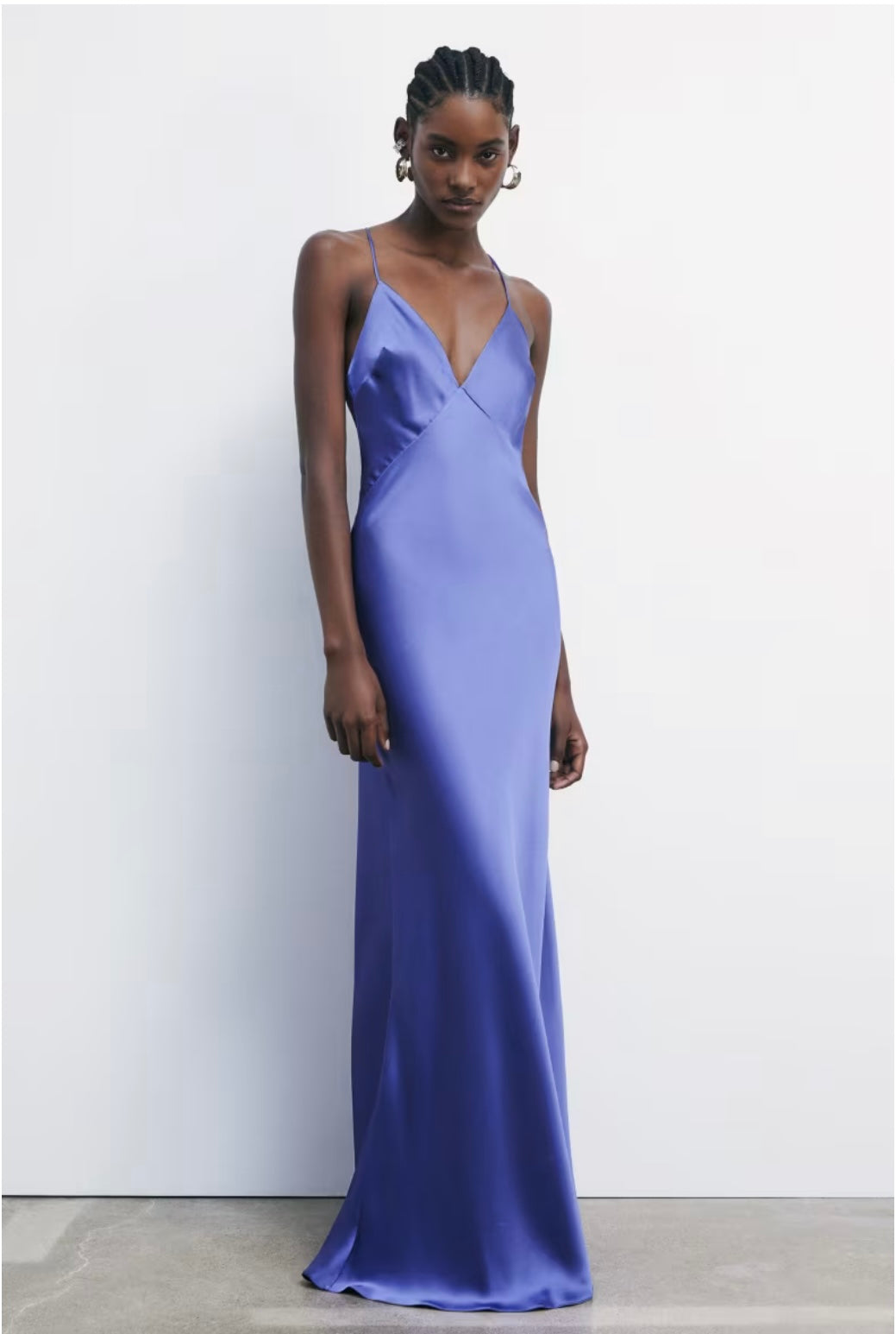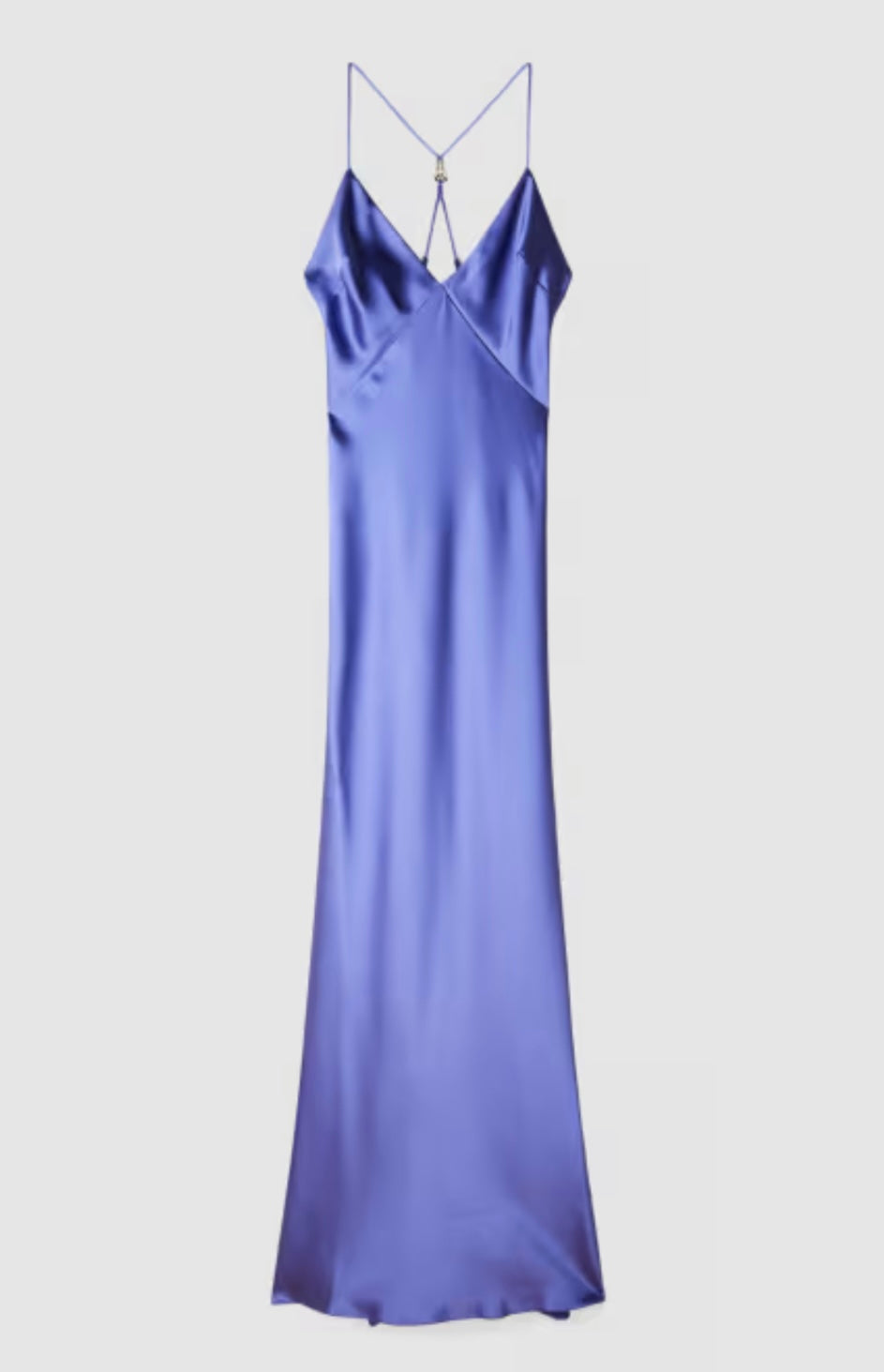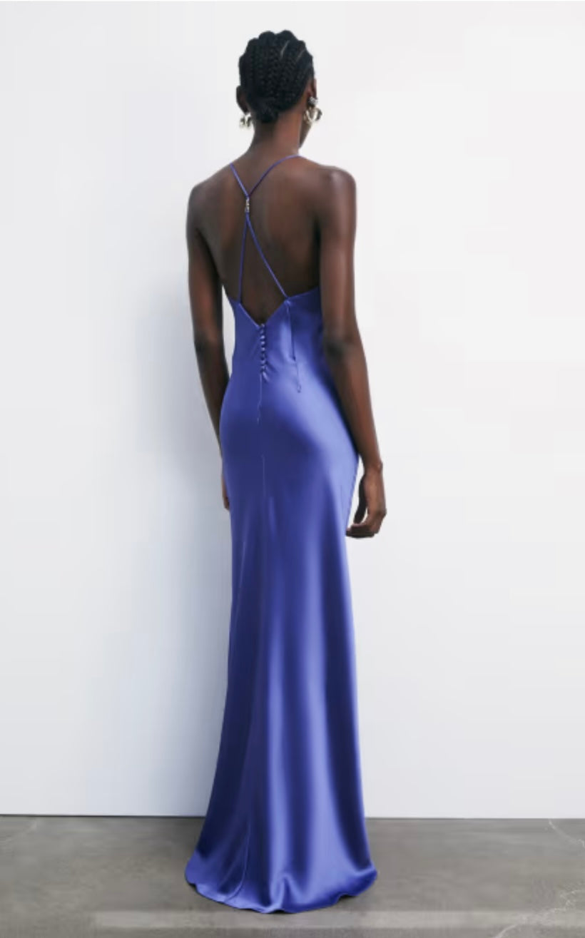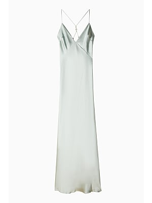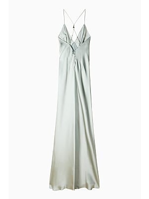 Abito lungo in raso lucido Patrizia Pepe. Leggero e sofisticato, dalla vestibilità scivolata. Scollo profondo a V e chiusura dietro con bottoni tono su tono.