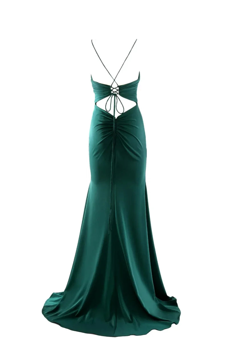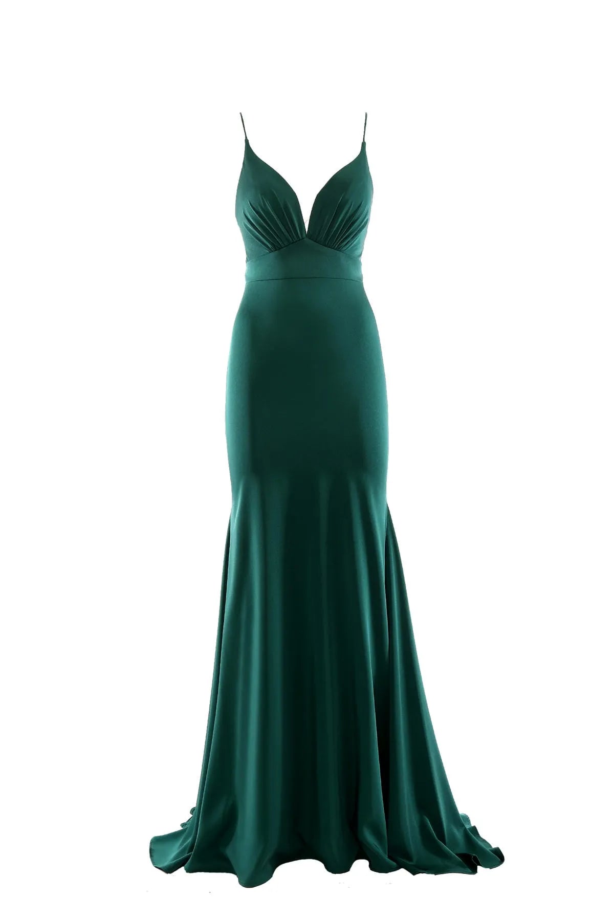 Abito da sera lungo in raso con scollo profondo e schiena nuda. Corpetto caratterizzato da scollo a V che mette in risalto il décolleté. Spalline sottili e gonna svasata.