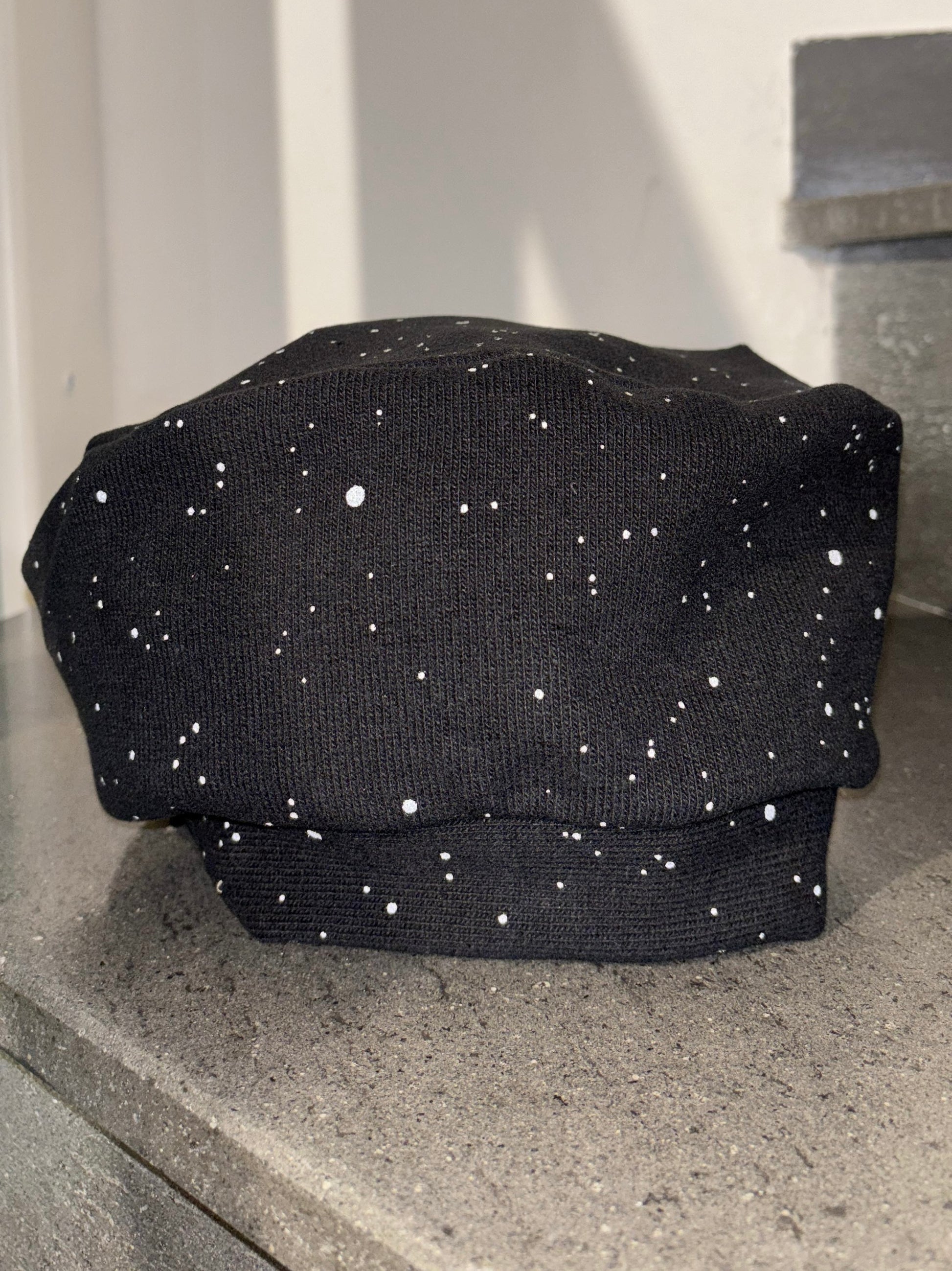 Cappello modello basco, un accessorio fine ma giocoso. Dettaglio dei mini pois stampati all-over.