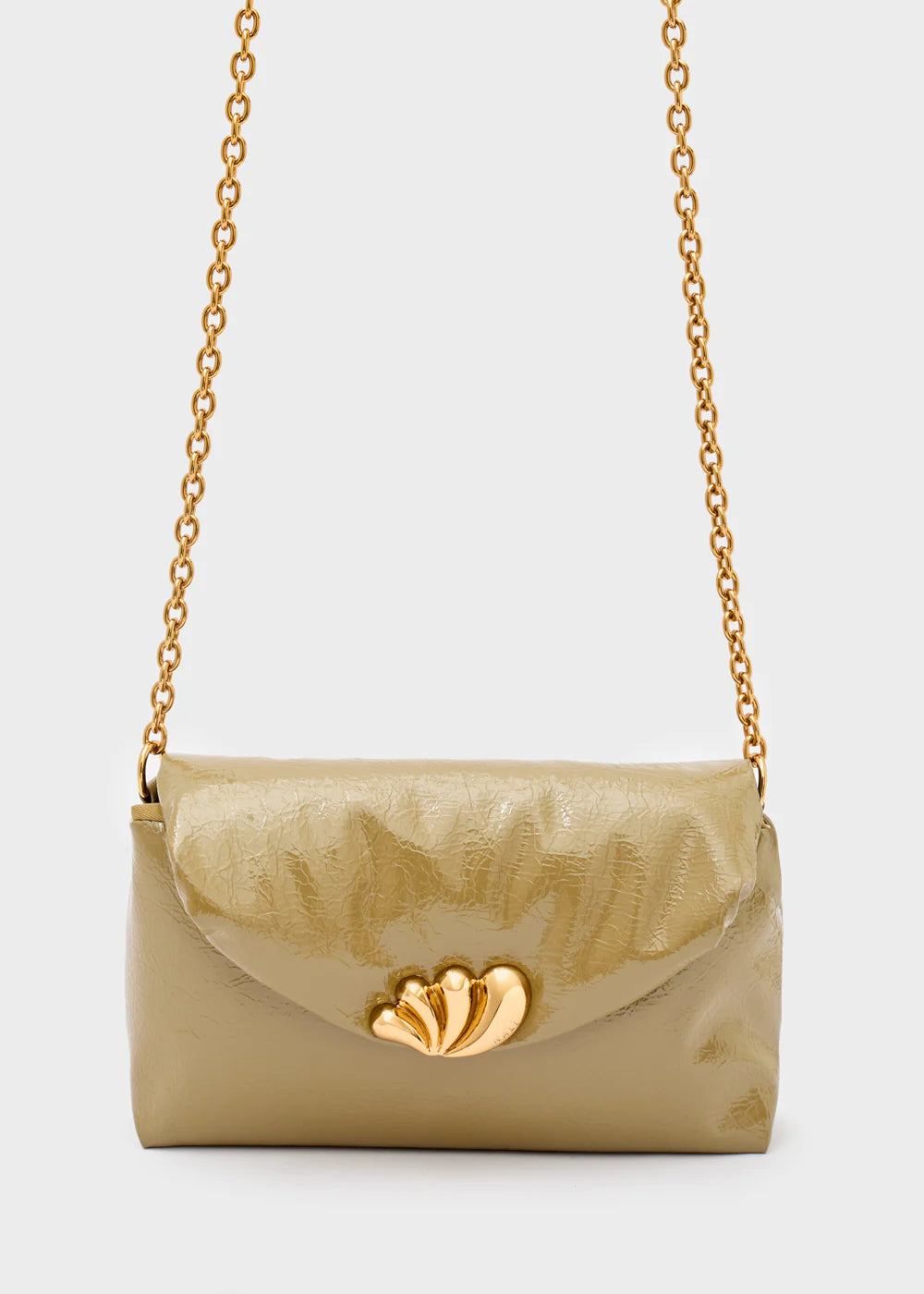Borsa a tracolla compatta e raffinata, caratterizzata da una patta frontale con chiusura gioiello e tracolla a catena, ideale per eventi e serate eleganti.