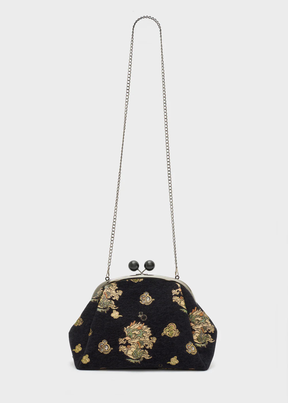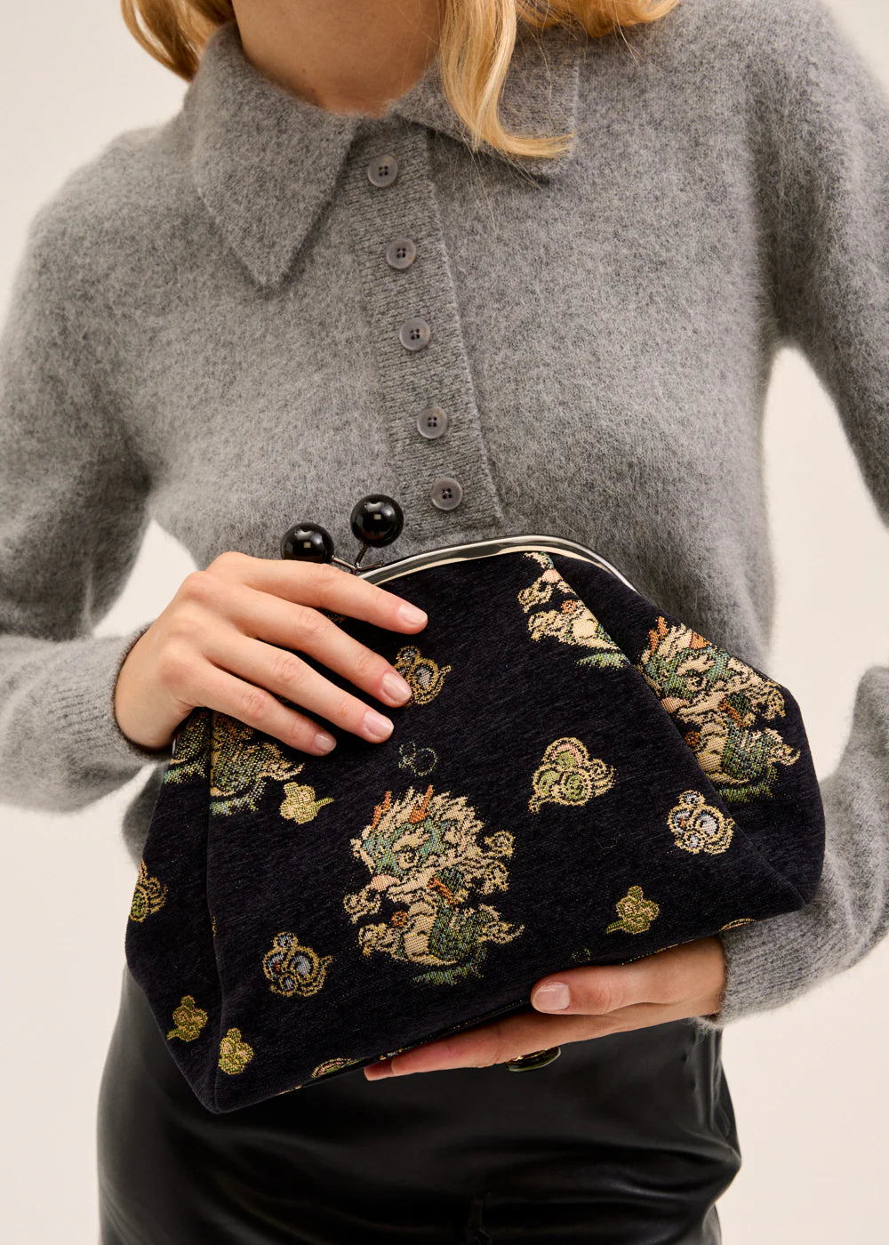Borsa a mano in tessuto jacquard nero con motivo floreale orientale e chiusura a scatto con sfere nere. Design vintage e sofisticato.