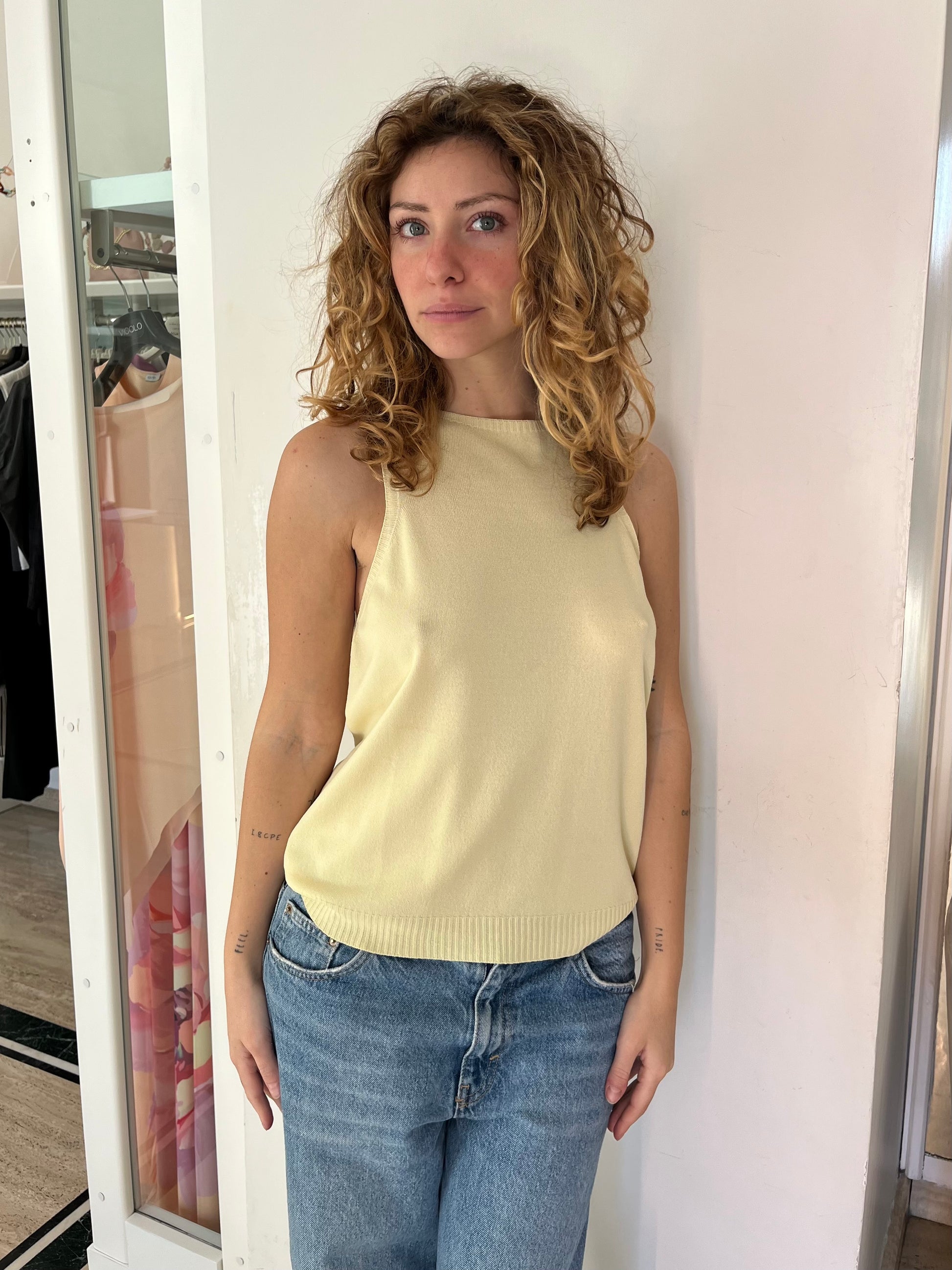 Canotta modello tank top. Modello smanicato con giromanica ampio, orlo a costine, vestibilità morbida.