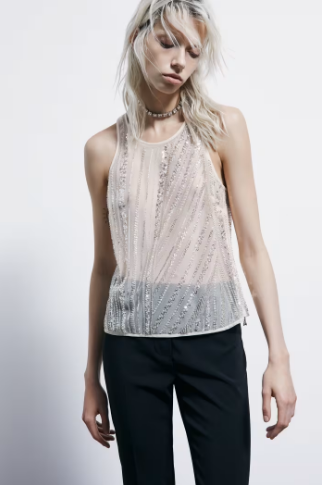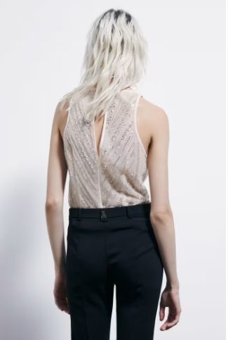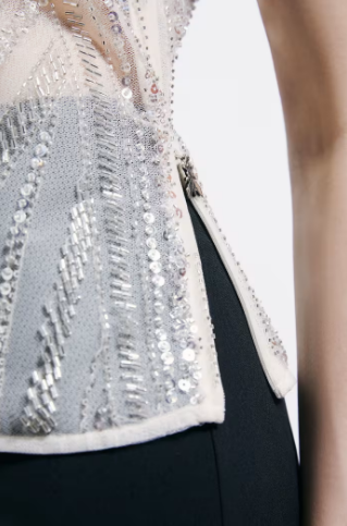 Canotta gioiello, dove i ricami di perline illuminano il tulle. scollo rotondo con cut-out a goccia e bottoncino logato sul retro. Tirazip Fly in metallo. Vestibilità morbida.