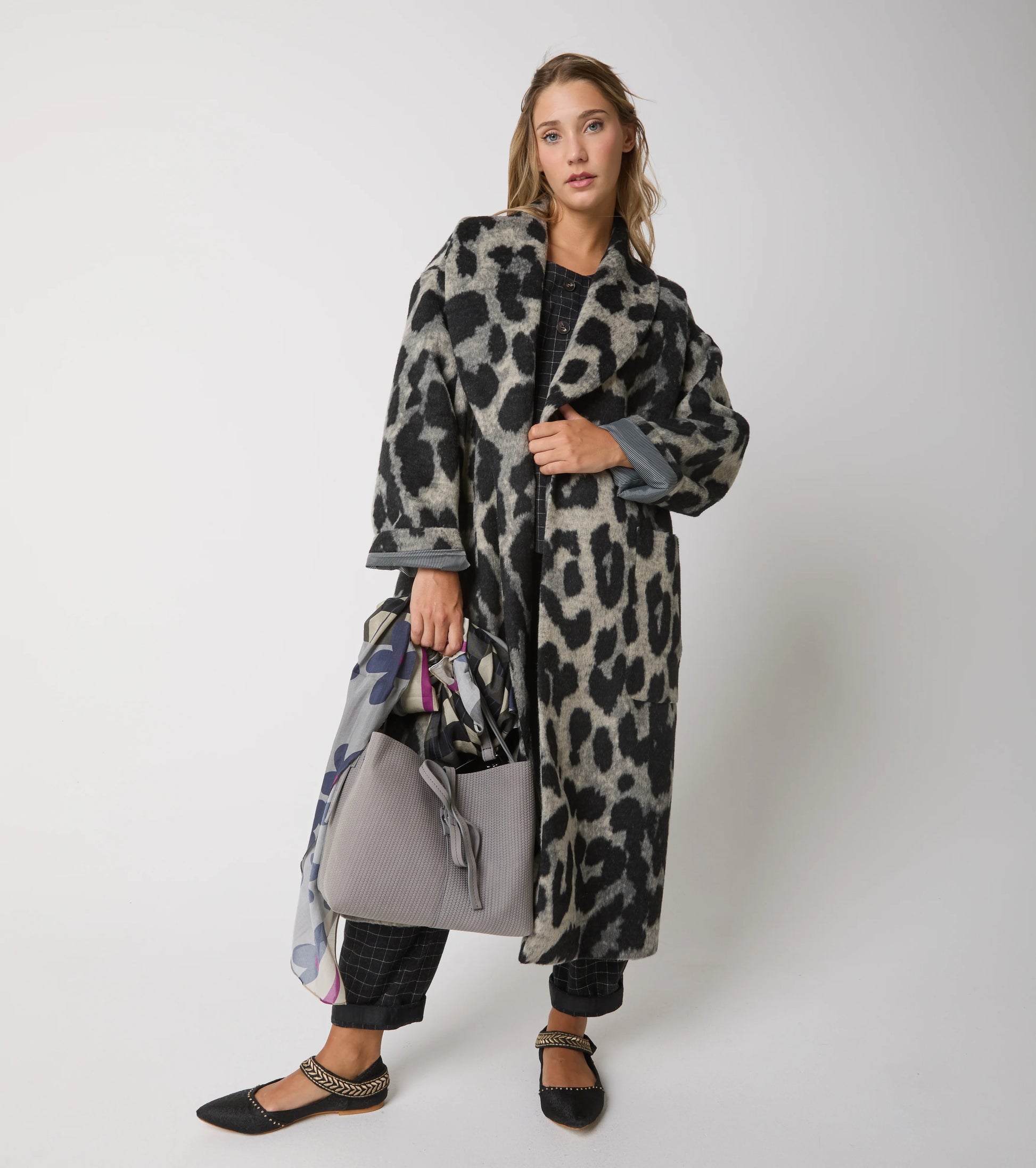 Cappotto in lana e cotone animalier con cintura Alessia Santi. Modello dalla linea avvolgente con collo a revers, tasche applicate e cintura sottile in vita.