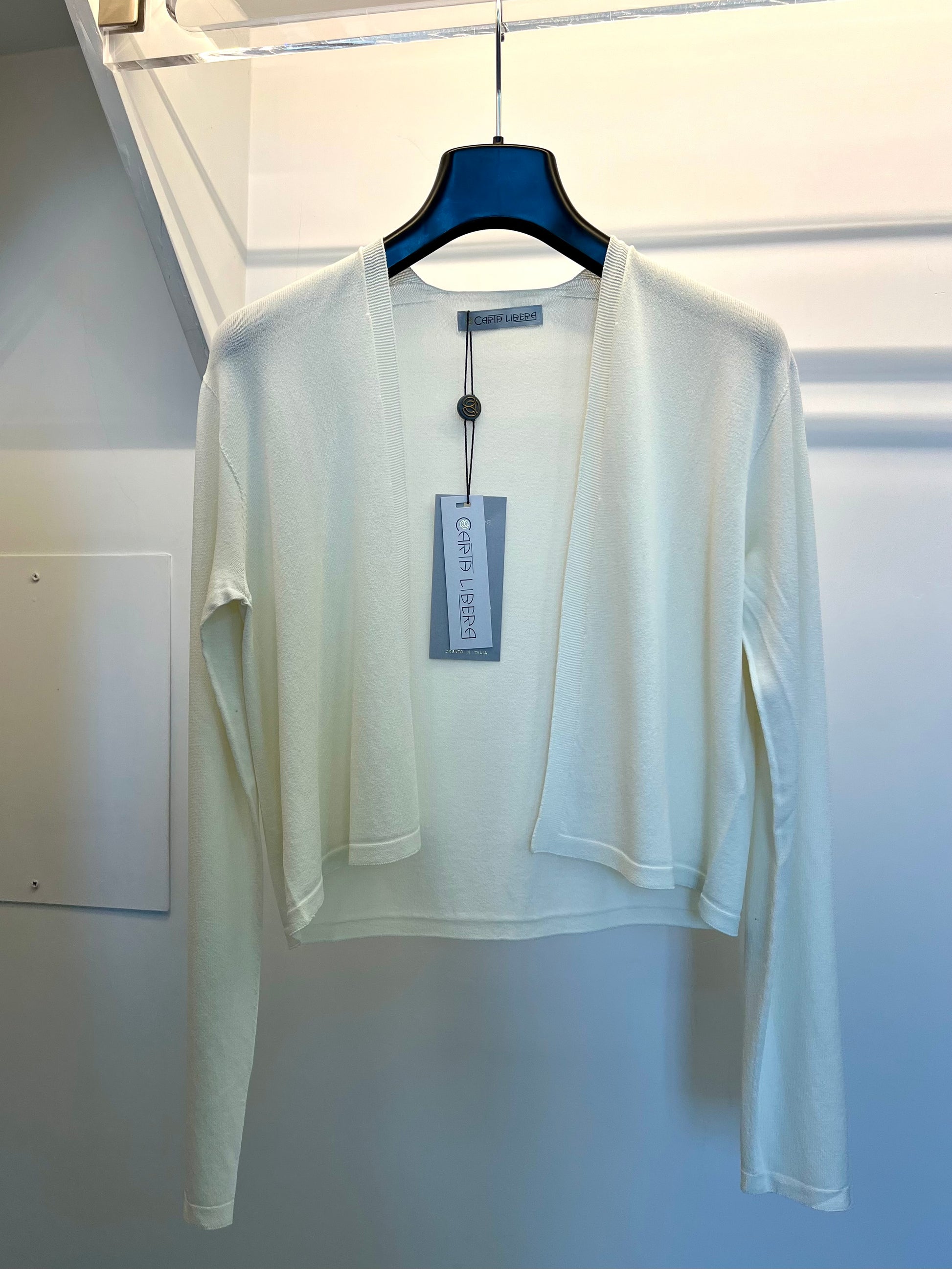 Cardigan corto in maglia (modello cropped) a maniche lunghe. Colori primaverili, tessuto fresco: il capo perfetto per le stagioni soleggiate.