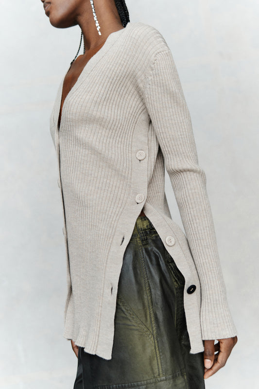 Cardigan lungo a coste con bottoni. Particolare le aperture nei laterali con bottini che si estendono per tutta la lunghezza del capo. Manica lunga. Vestibilità slim.