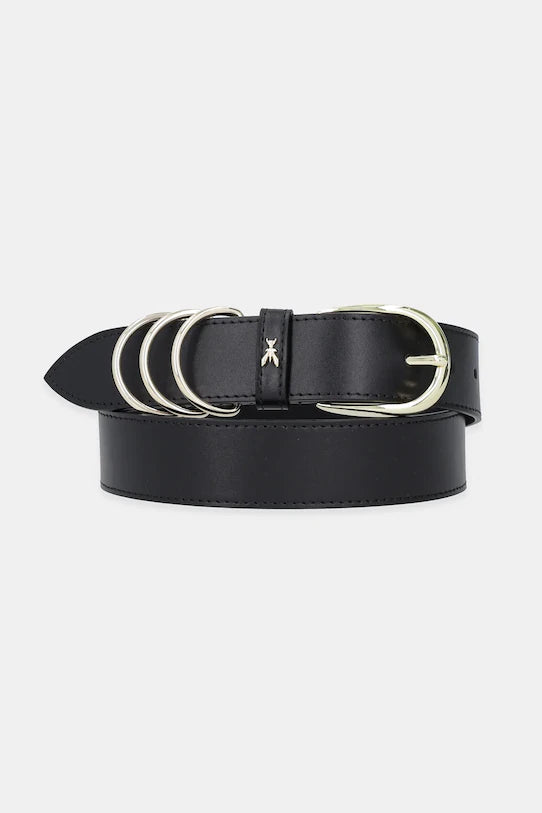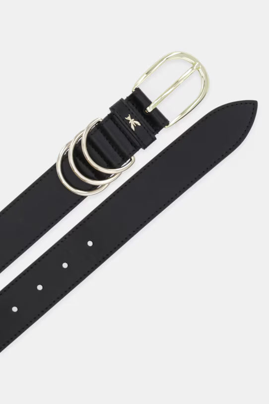 Cintura in pelle con molteplici anelli vicino la fibbia.
