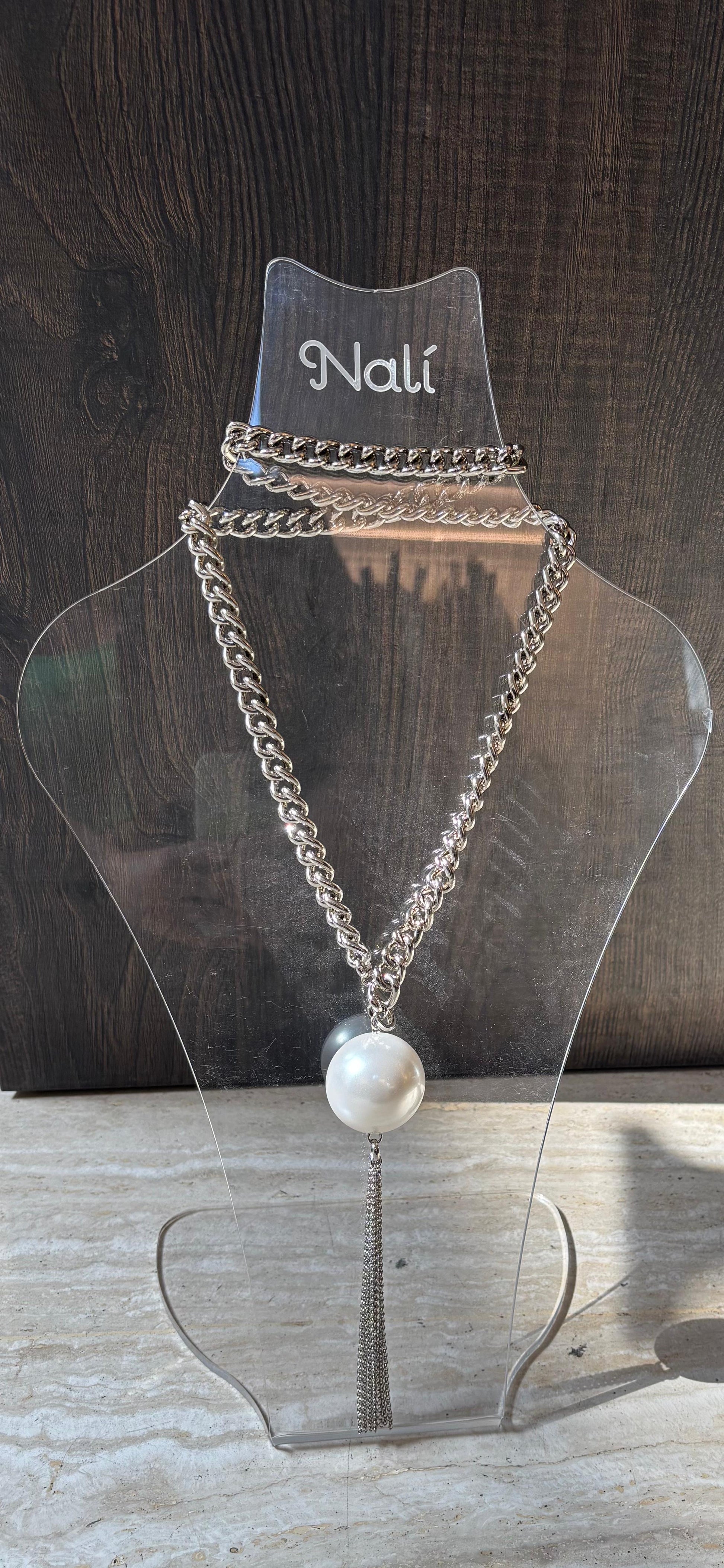 Collana lunga con maglia a catena e alla fine dettaglio della pallina gioiello.