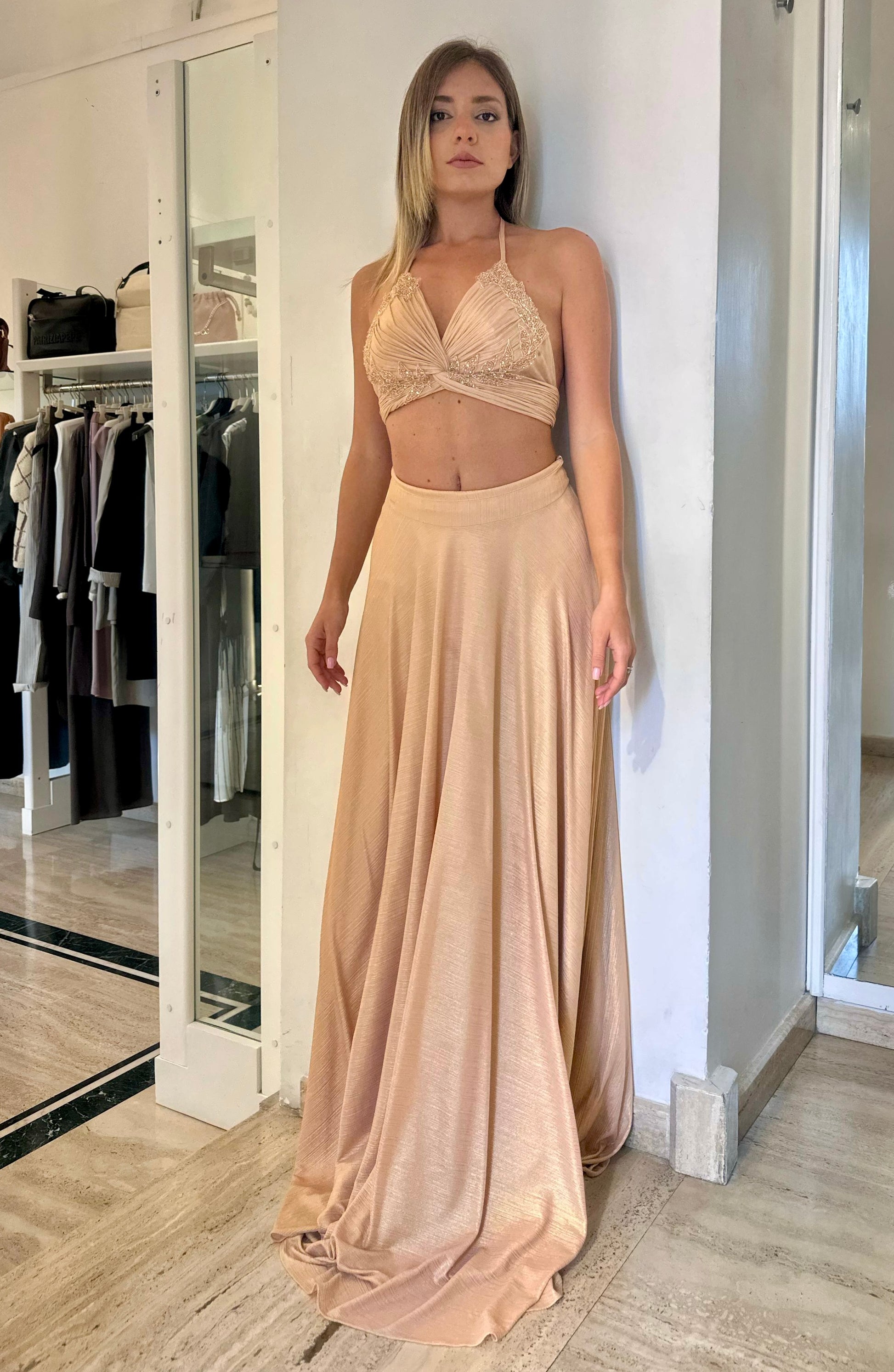 Completo composto da due pezzi top e gonna. Top con dettaglio incrociato, gonna morbida con fascia elasticizzata.