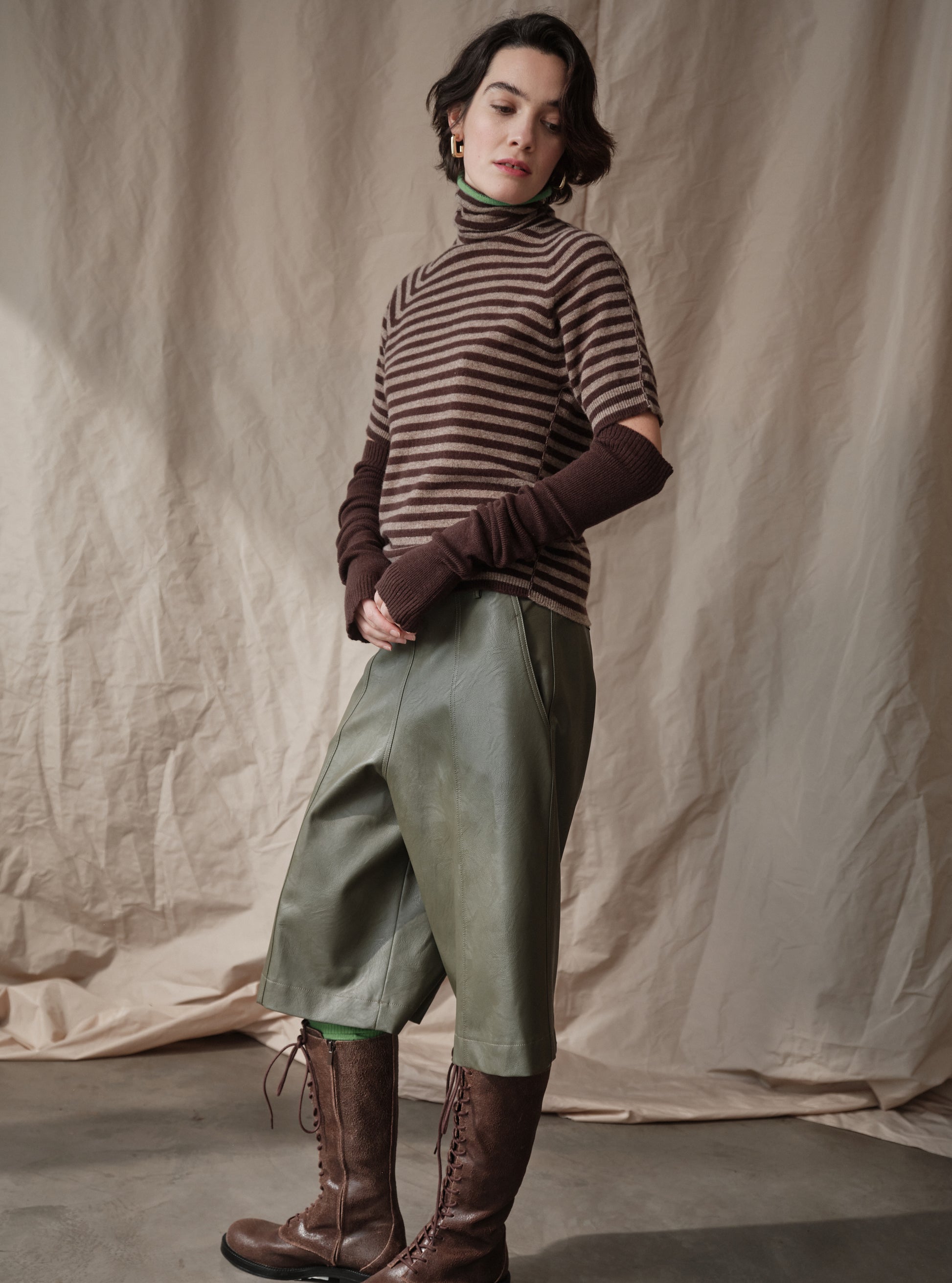 Dolcevita (maglia a collo alto) a righe strette. Mezza manica, vestibilità normale.
