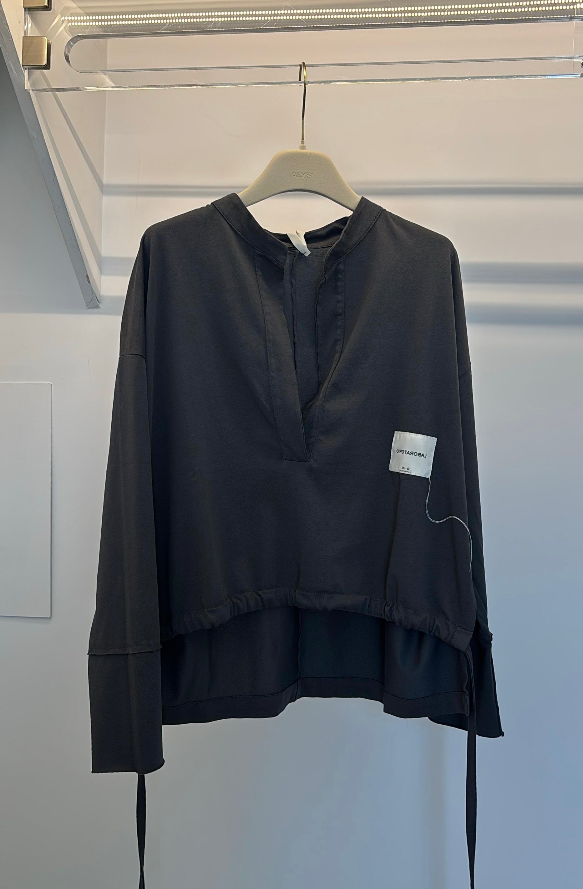 Felpa asimmetrica con scollo profondo a V / coreano. Dettaglio della patch con logo e del fondo con elastico per arricciare e stringere.