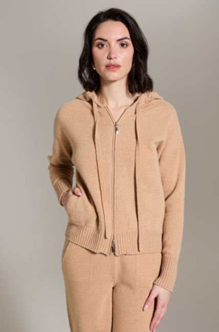 Felpa con cappuccio e chiusura zip. Fondo e polsini a coste.