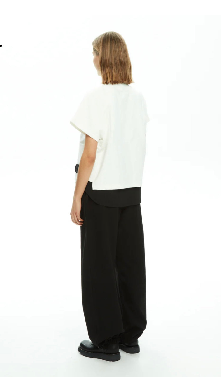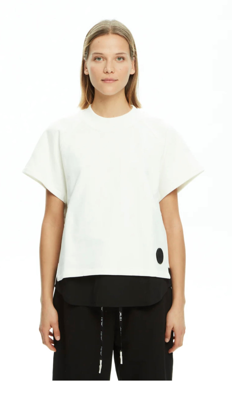 Felpa doppiata MLO Malloni, vestibilità over con spalle scivolate e maniche corte ampie, design pulito e arricchito dal patch logo in rilievo, stratificazione a contrasto con inserto nero sul fondo.
