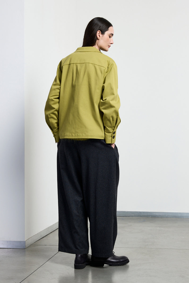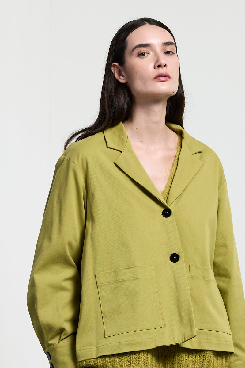 Giacca corta modello a scatoletta. Chiusura con due bottoni, tasche quadrate e polsino a camicia con bottoni. Vestibilità leggermente ampia.