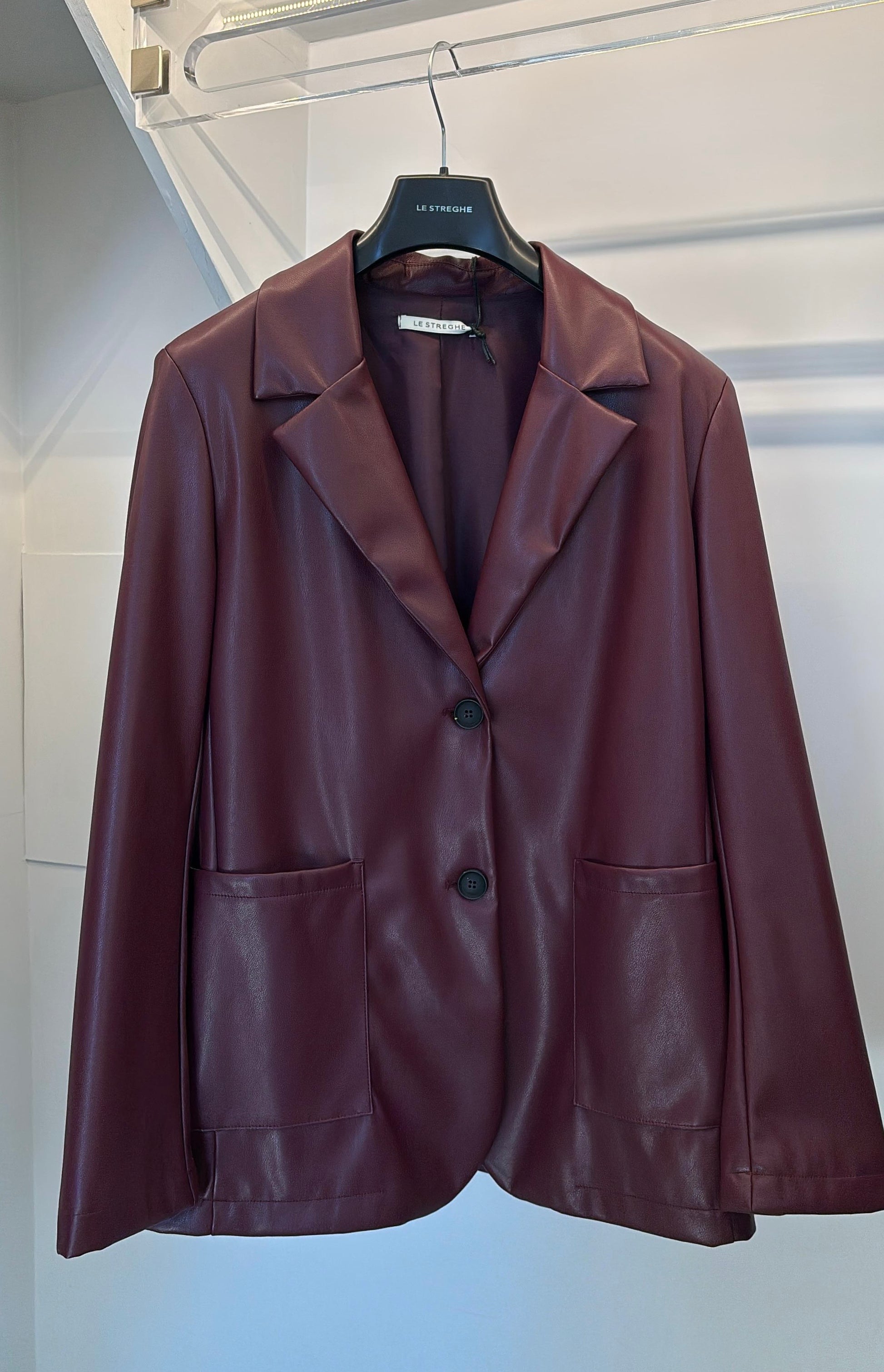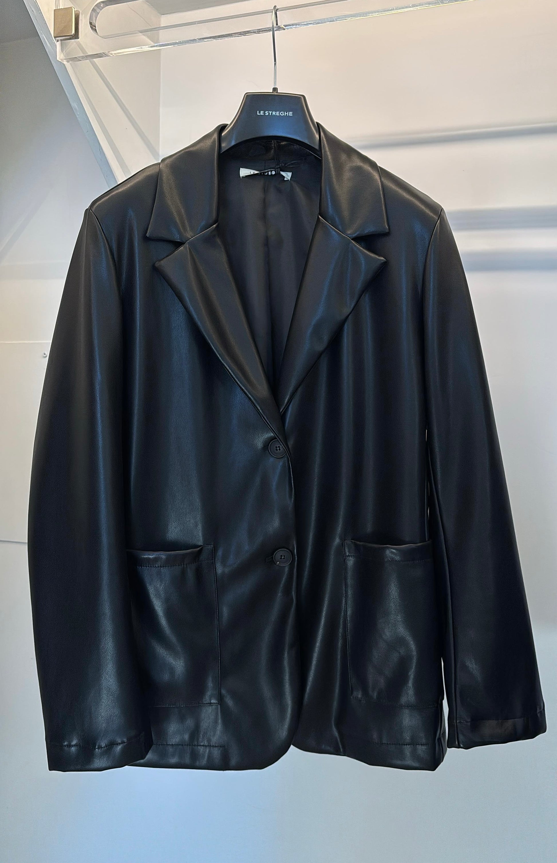 Giacca classica in ecopelle, modello blazer. Colletto classico, doppia tasca anteriore.