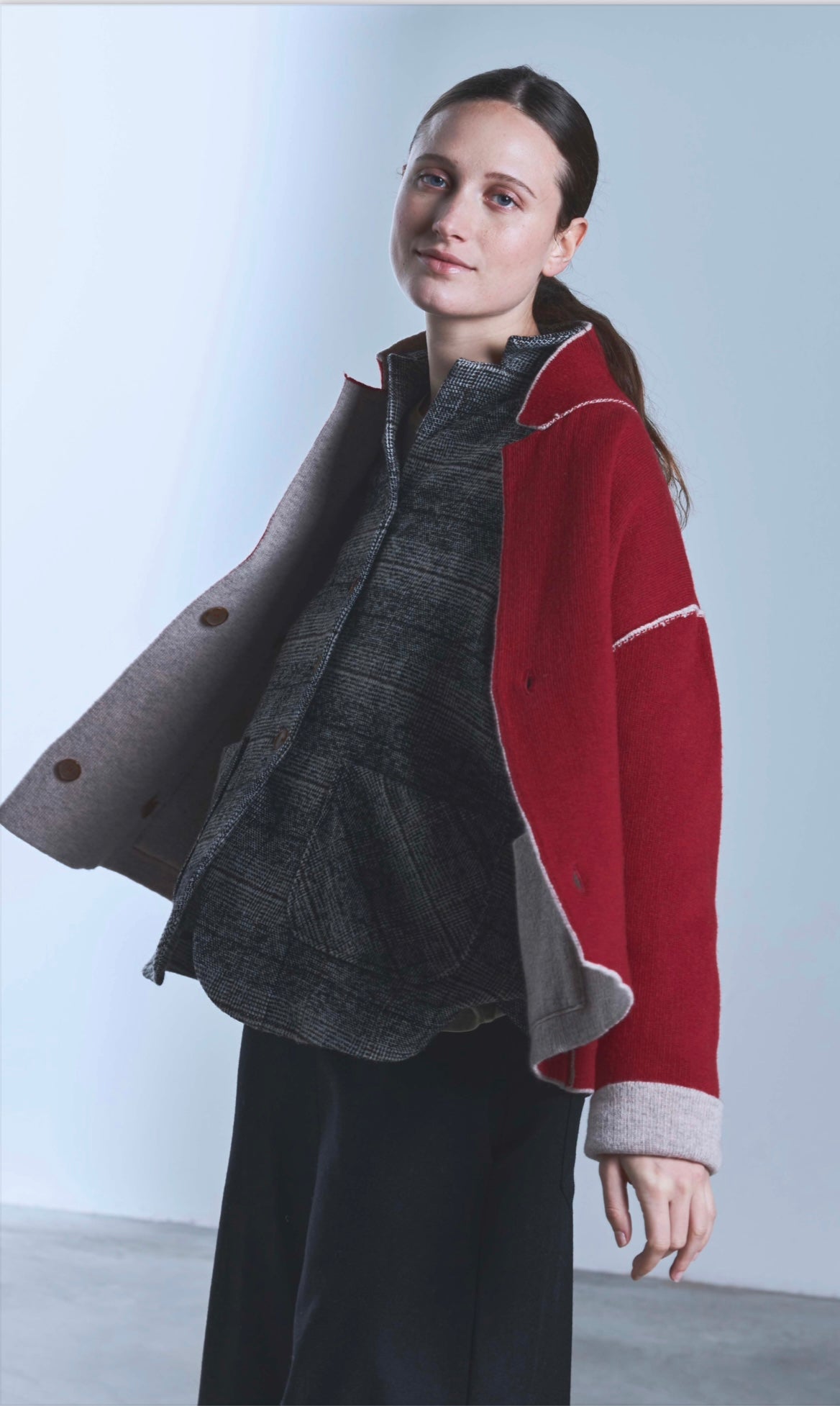 Giacca in lana reversibile TreBarraBi. Doppiopetto con bottoni e cuciture in rilievo. Vestibilità over.