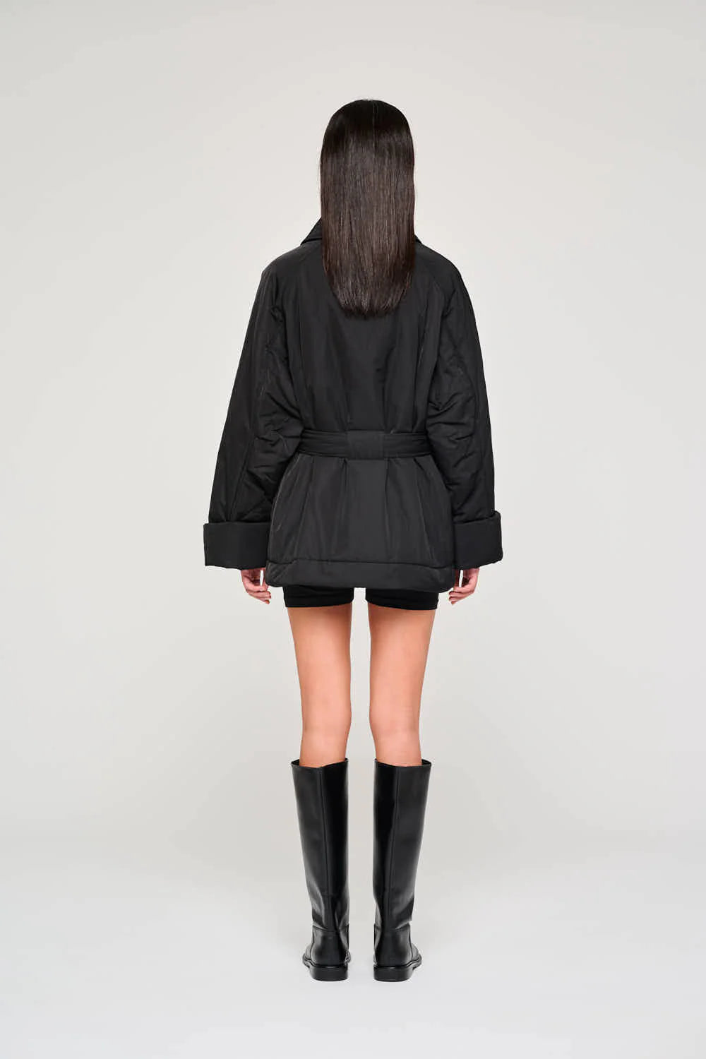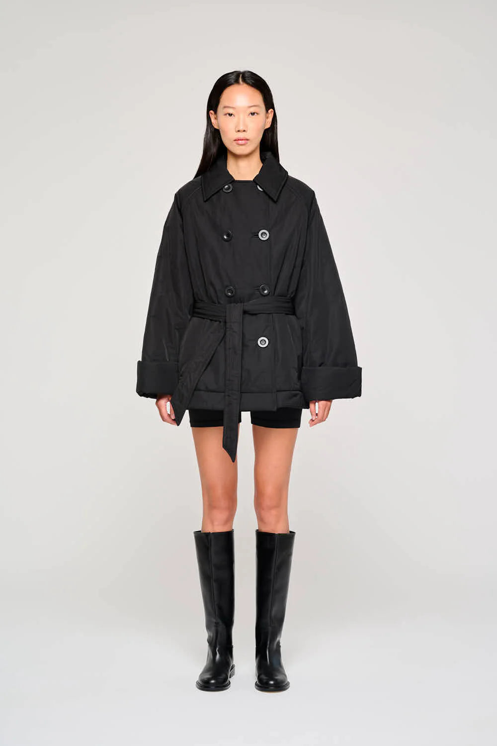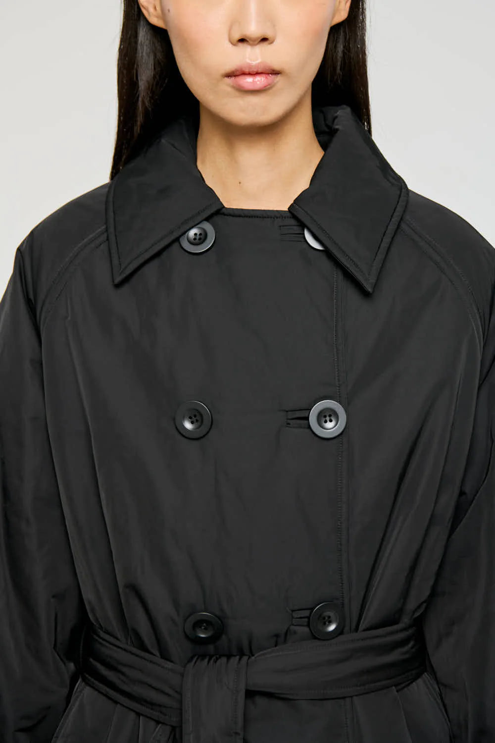 Giacca corta in nylon modello cappotto con cintura in vita per enfatizzare la silhouette. Colletto classico, bottoni anteriori, vestibilità normale.