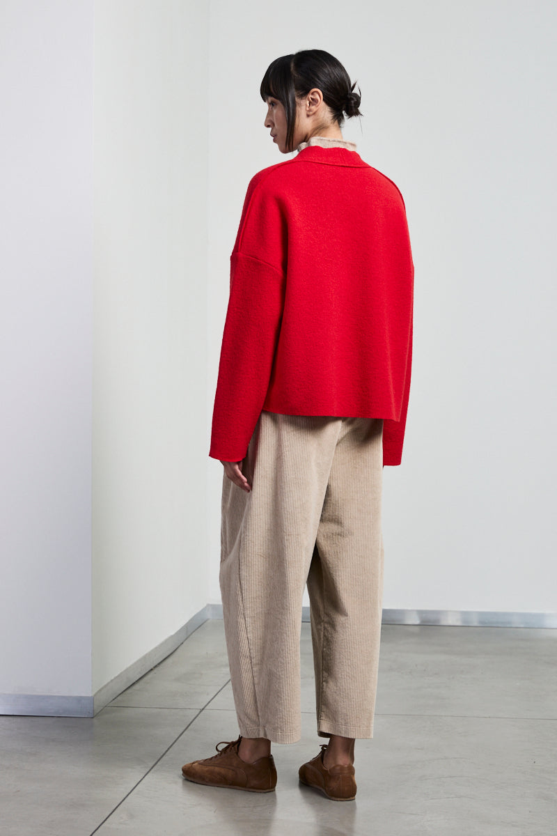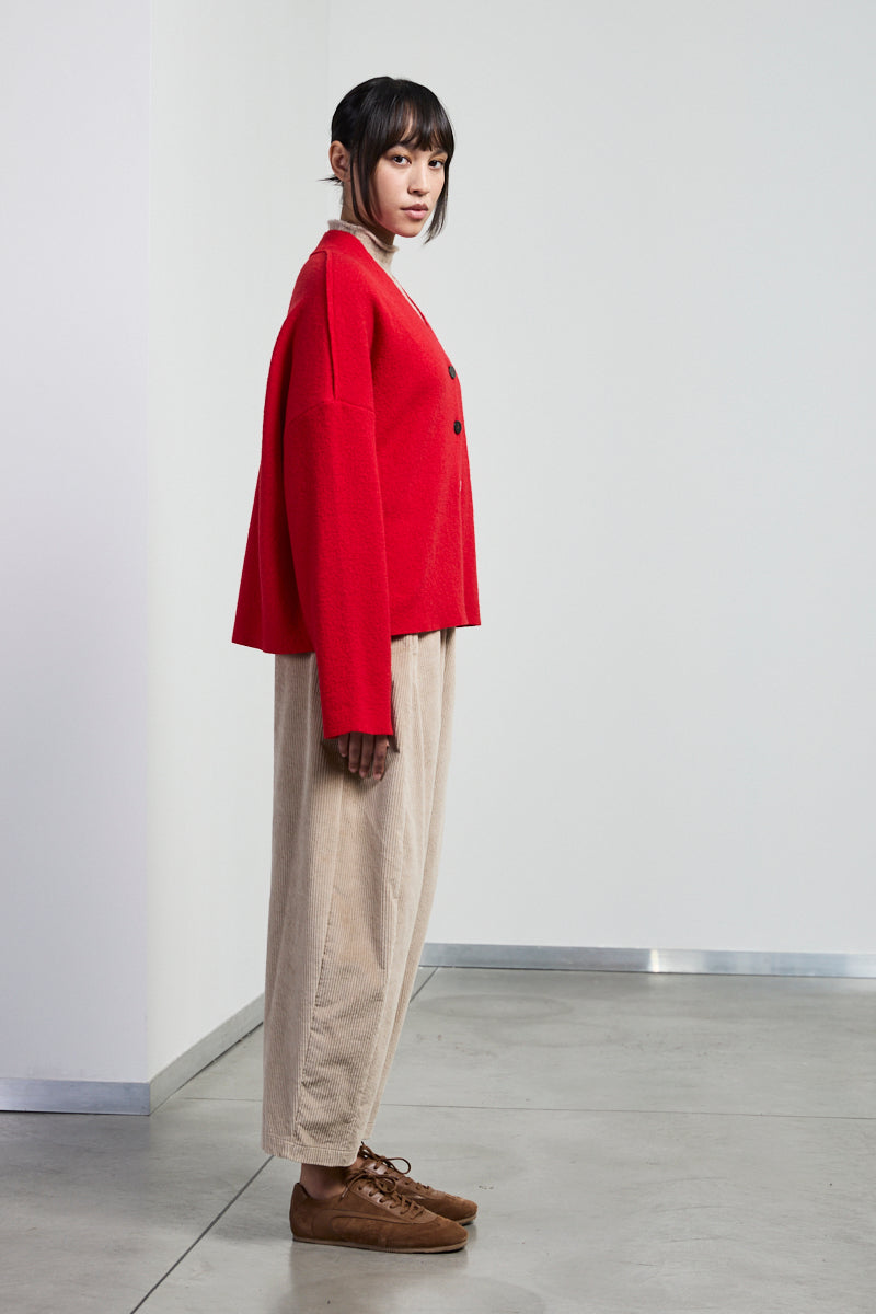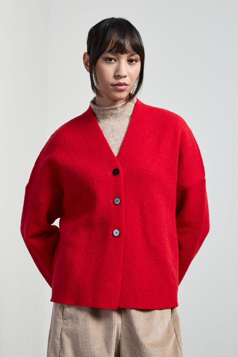 Giacca senza collo in lana cotta Neirami. Lunghezza alla vita, chiusura con tre bottoni, vestibilità dritta.