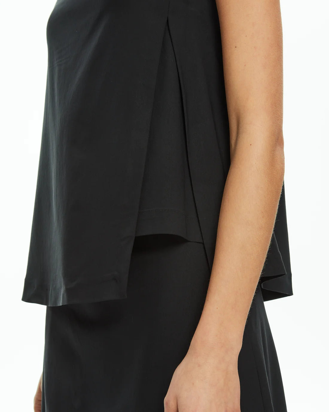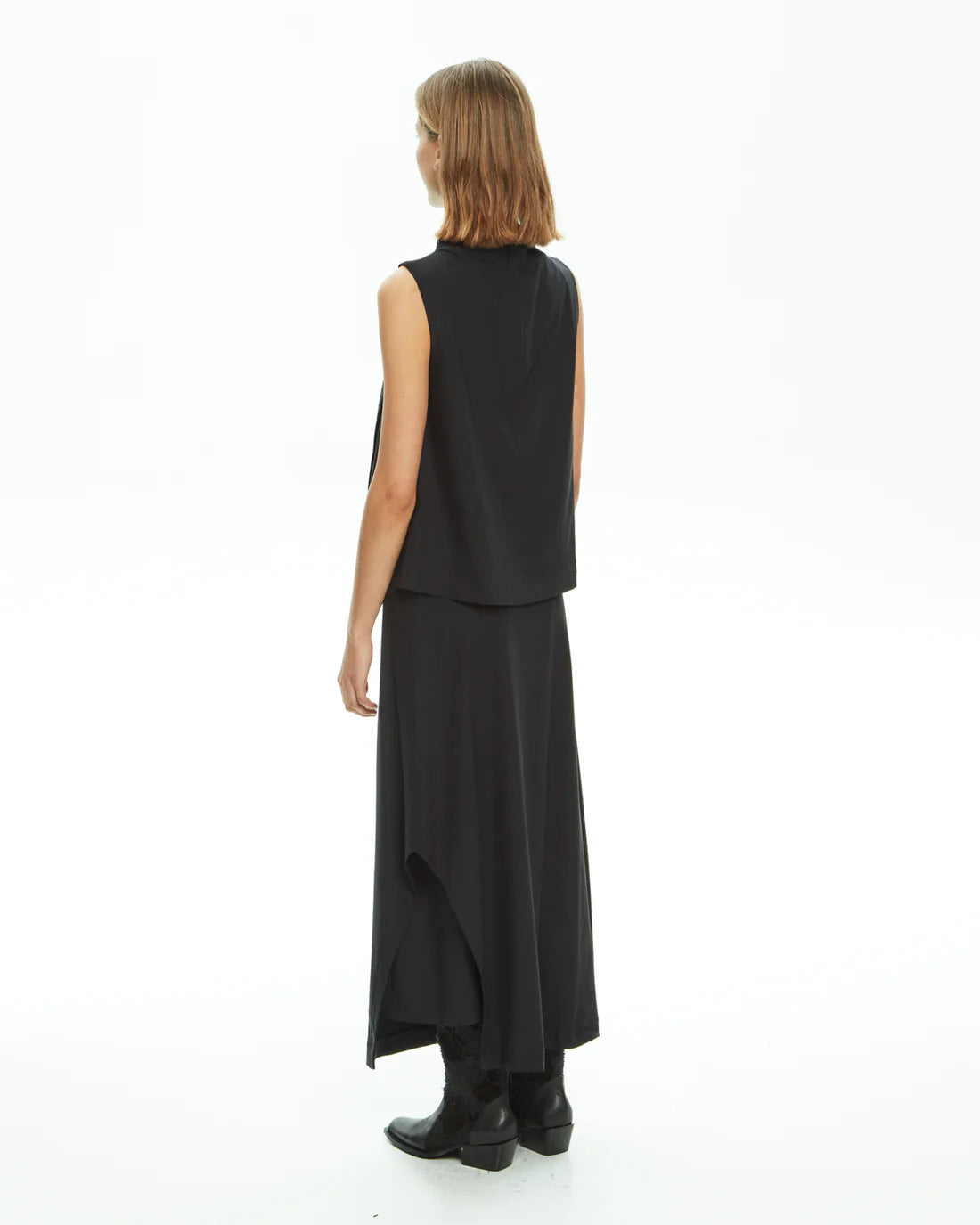 Gilet raffinato e versatile, perfetto per chi desidera un look minimal ma di carattere. Realizzato in tessuto leggero e fluido, presenta una linea smanicata con taglio asimmetrico che dona movimento e valorizza ogni silhouette. Grazie al suo design moderno e senza tempo, questo top gilet nero può essere indossato sia come protagonista del look, abbinato a pantaloni o gonne a vita alta, sia come strato sopra un abito lungo per un effetto sofisticato e originale.