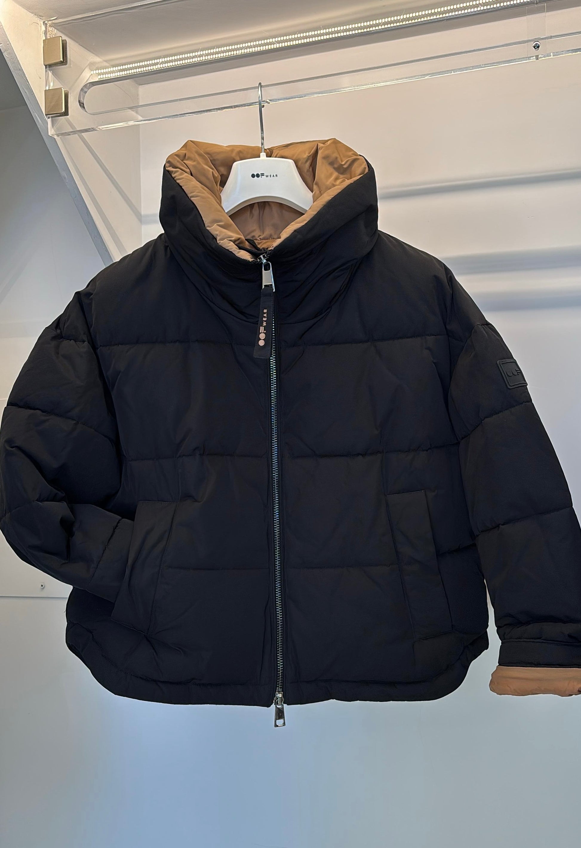 Giubbino imbottito a mezzo collo con interno a contrasto di colore. Doppia tasca anteriore, modello leggermente morbido.