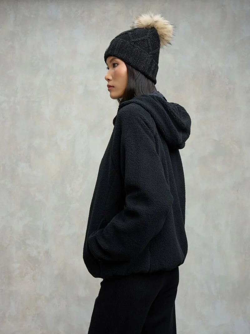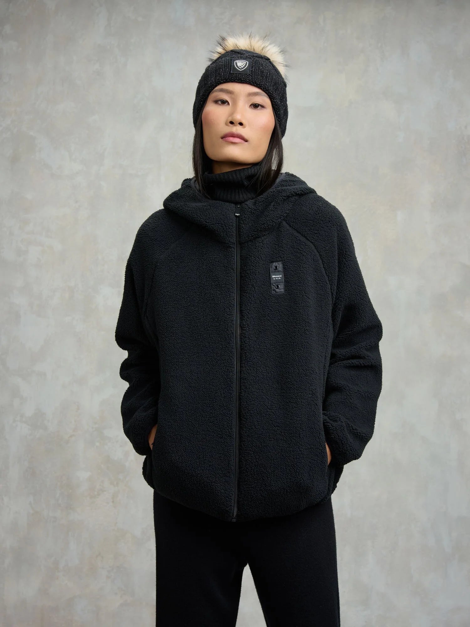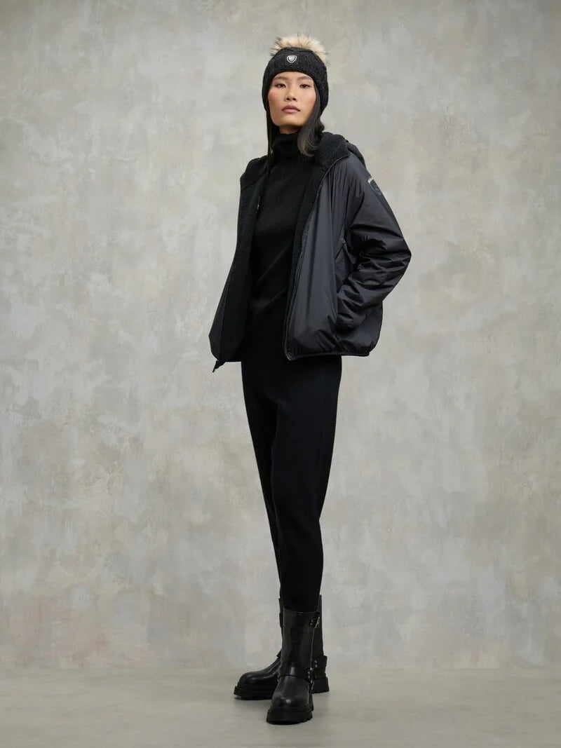 Giubbino reversibile con maniche raglan, liscio da una parte e con pelliccia ecologica dall’altra. Capo unico da utilizzare in due versioni per offrire versatilità e alternativa e adattarsi alle diverse occasioni. Cappuccio fisso, pelliccia ecologica in poliestere. Fondo capo e polsini con elastico, dettaglio del patch con scudo nella parte liscia e passante con logo dall’altra.