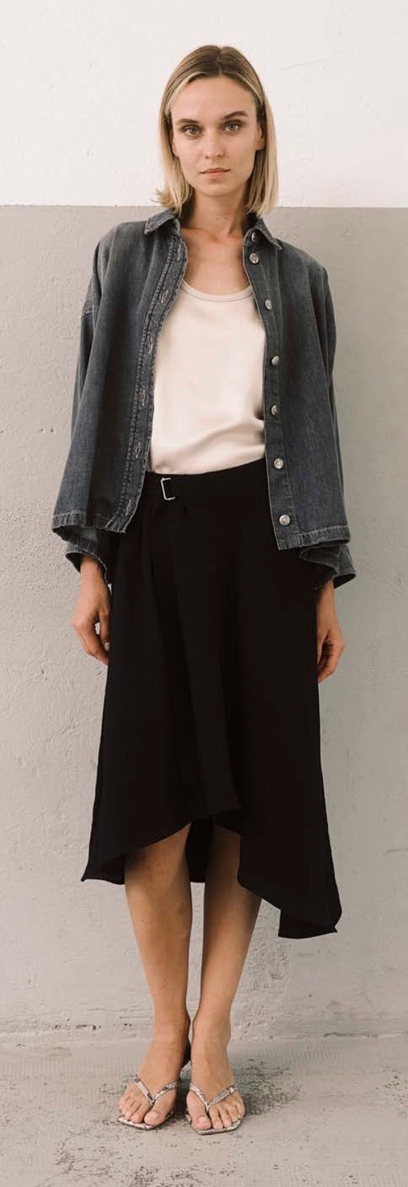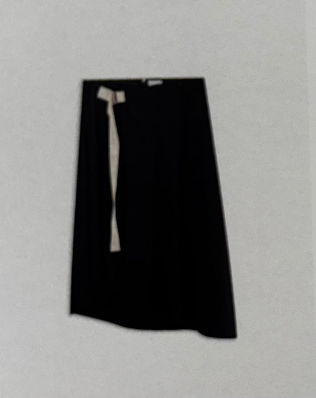 Gonna in misto lino con finta cintura. Motivo laterale con pinces. Modello leggermente ad ovetto con fondo asimmetrico.