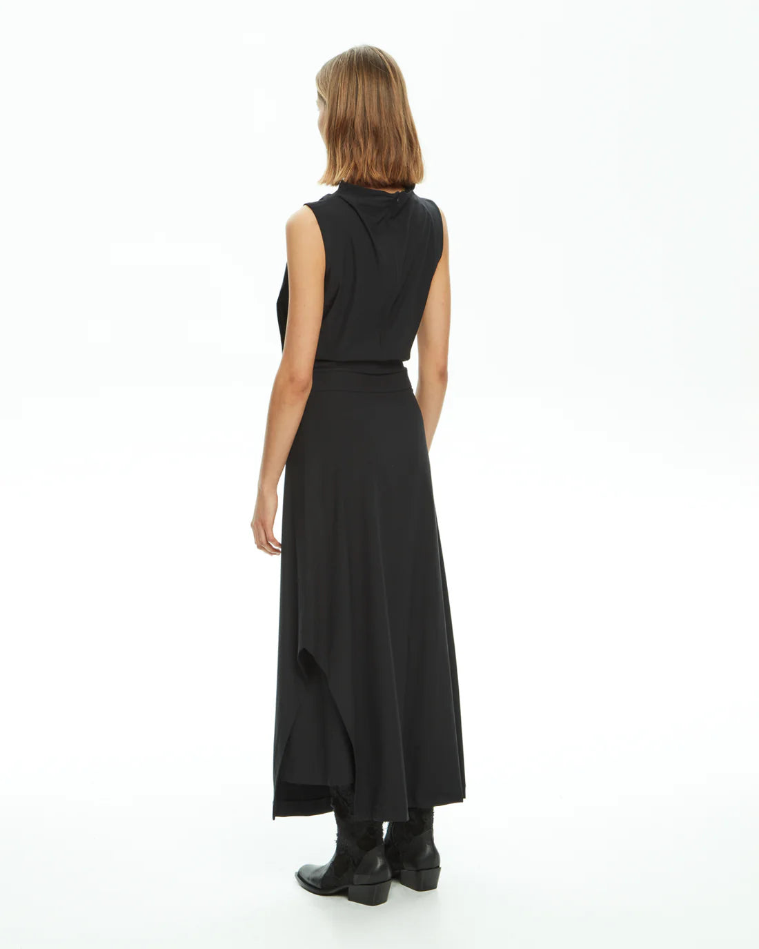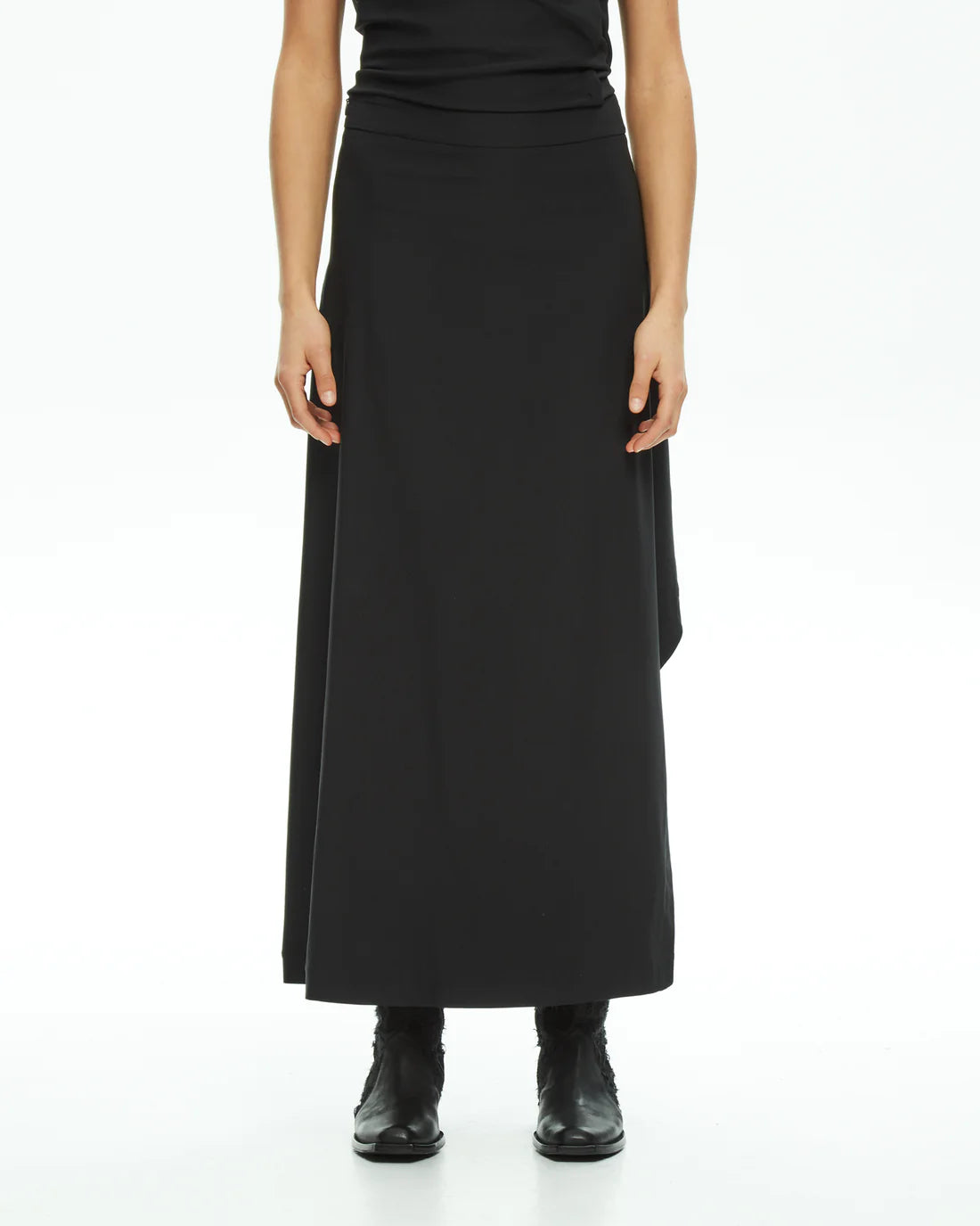 Gonna in misto viscosa elasticizzata. Tessuto effetto armatura con gioco di sovrapposizione lateralmente. Chiusura tramite zip nascosta al lato. Vestibilità morbida.