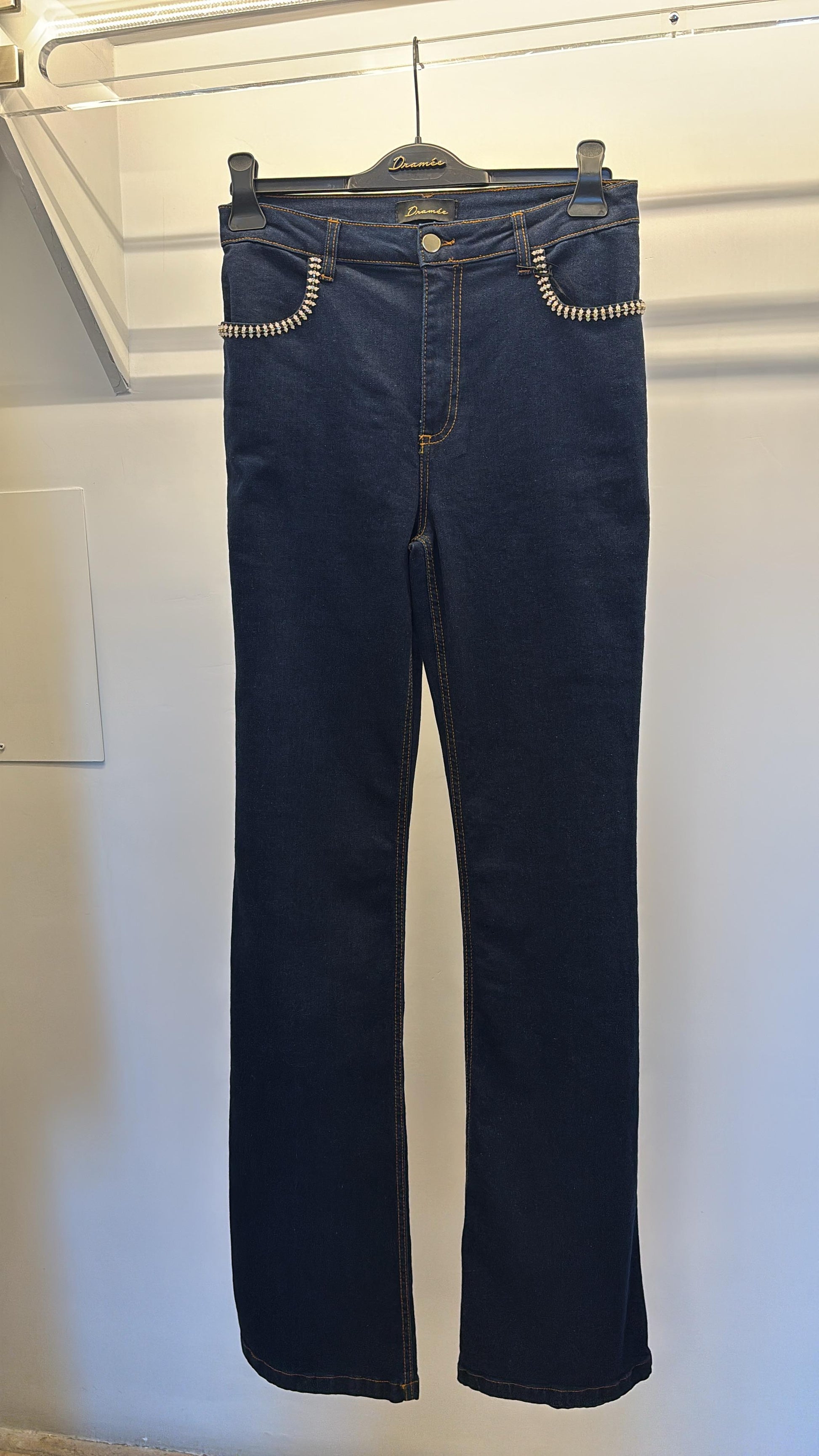 Jeans modello classico a zampa. Gamba dritta, dettaglio gioiello sulle tasche.