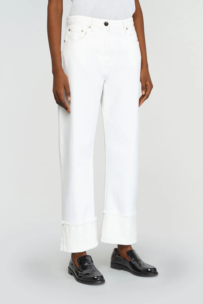 Jeans bianco con risvolto sul fondo. Modello crop, cinque tasche, bottone logato e salpa sul retro. Vestibilità della gamba dritta, modello normale.