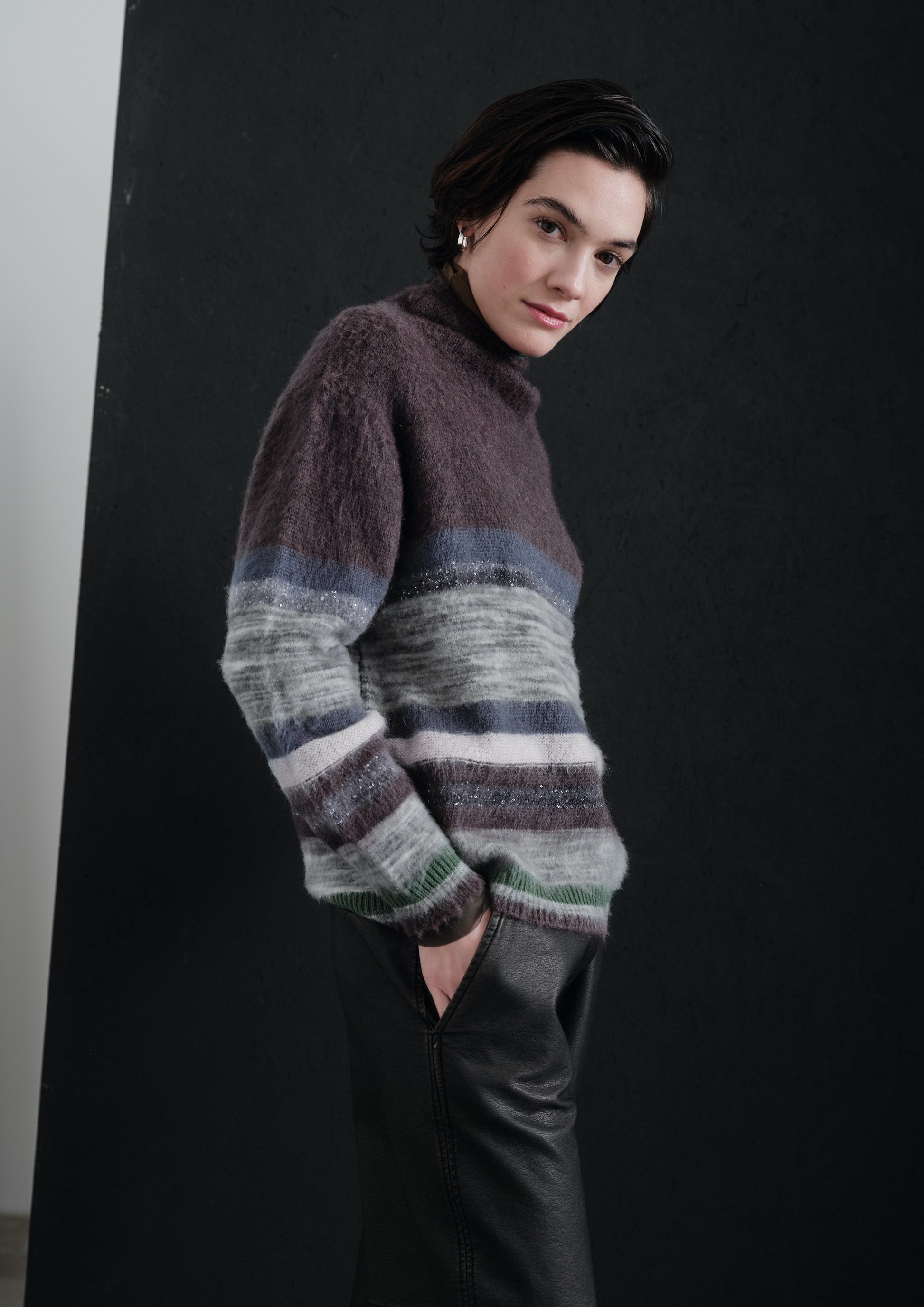 Maglia dolcevita pettinata con dettaglio delle righe multicolore e glitterate. Fondo e polsini a coste, vestibilità normale.