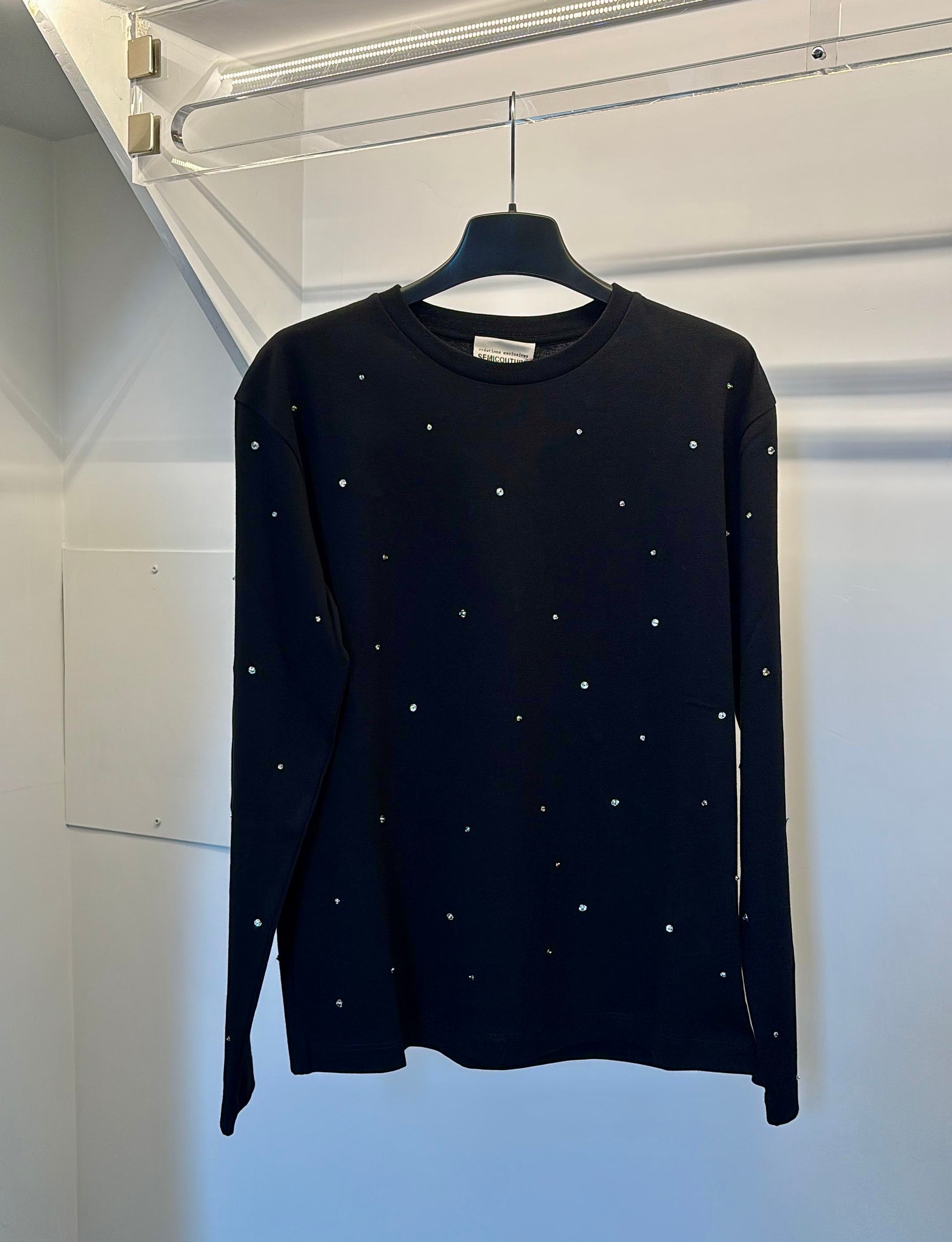 Maglia a manica lunga con strass applicati all-over. Modello aderente, scollo rotondo.