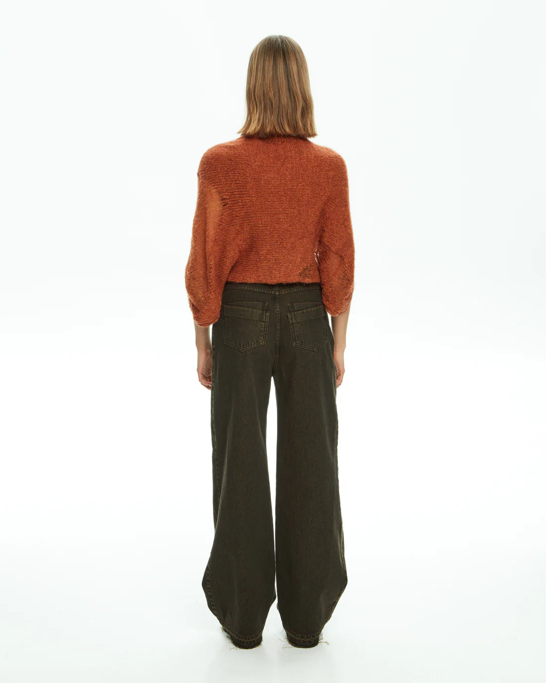 Maglia in misto mohair con maniche a tre quarti che cadono morbide. Tessuto in rete larga e stretta in finezza 7. Leggermente più corta sul davanti. Vestibilità morbida.