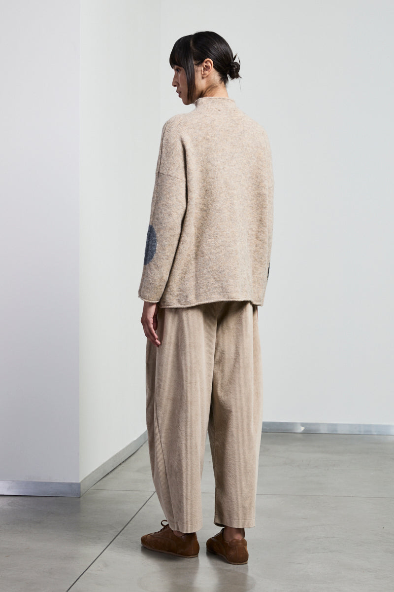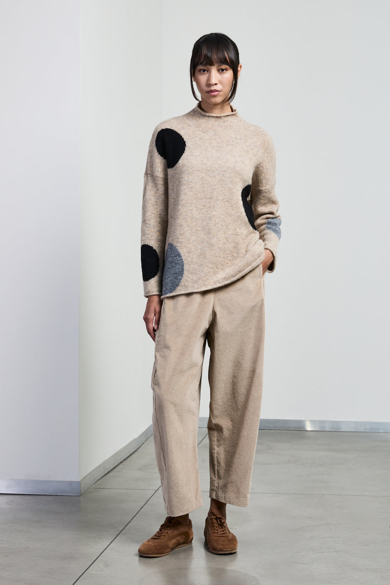 Maglia in lana e alpaca scollo camino. Manica lunga. Vestibilità over. Fantasia bolle colori in contrasto.