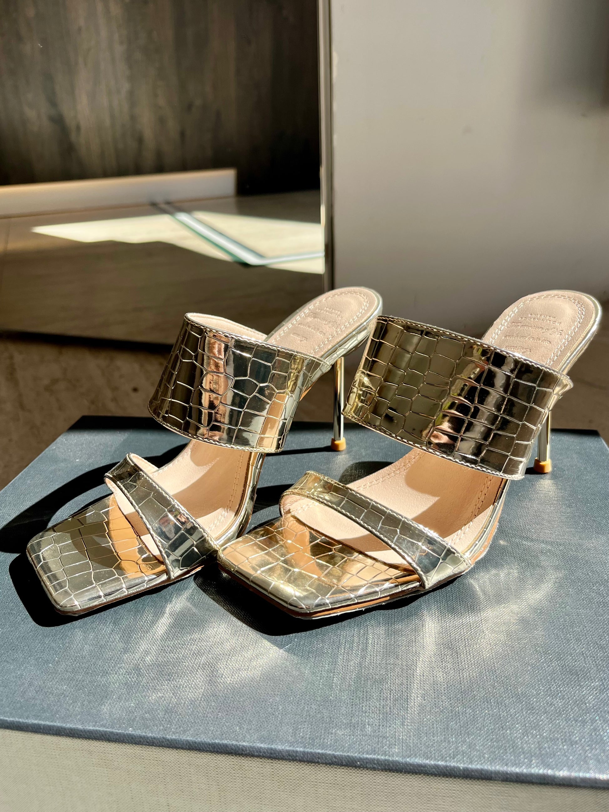 Sandali aperti con doppia fascia ampia sopra e sottile sotto. Trama coccodrillata.