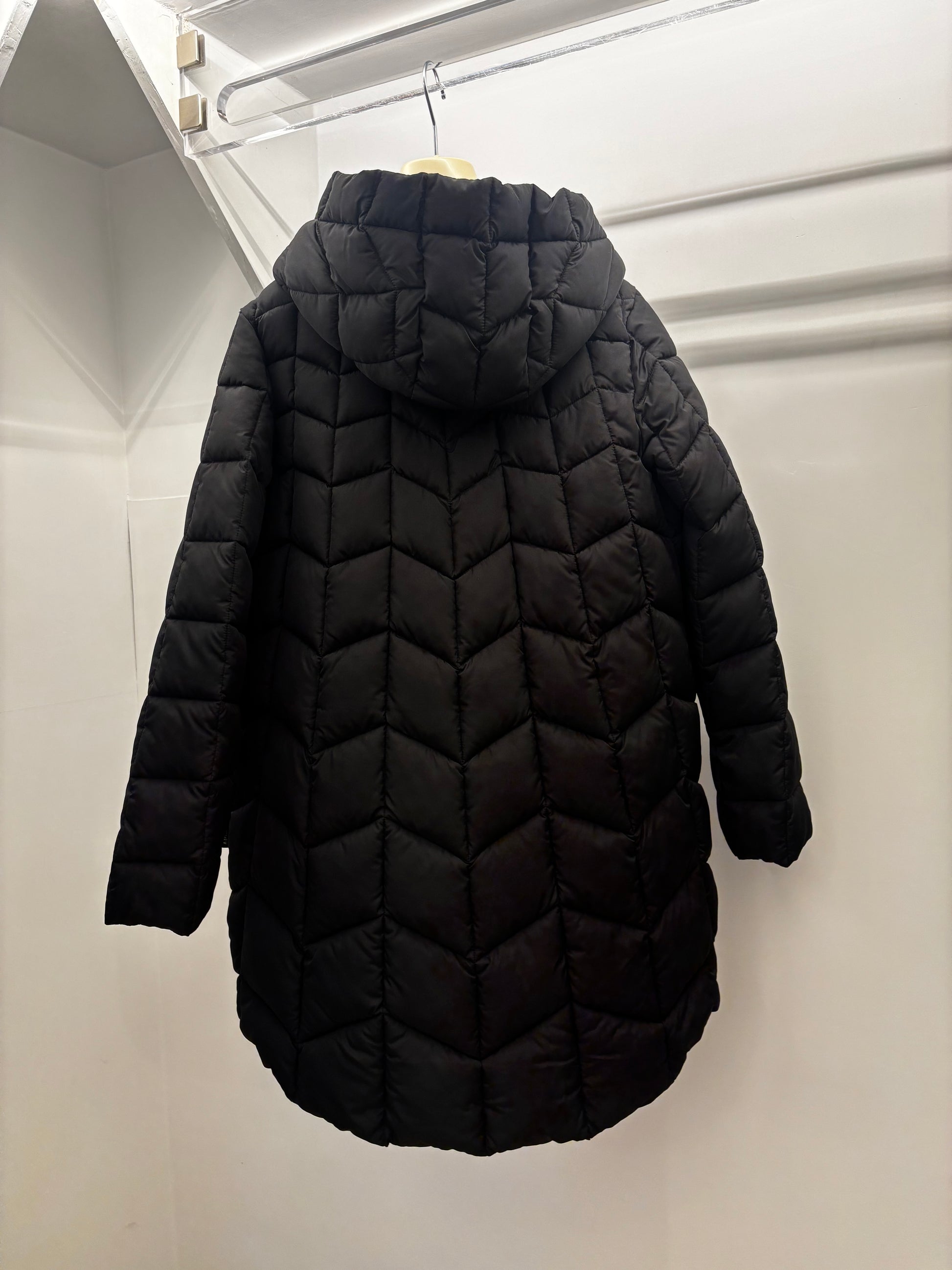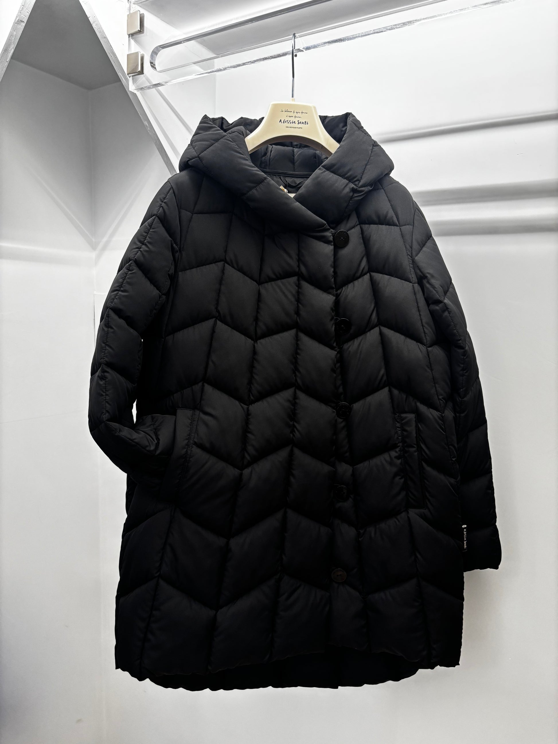 Piumino midi asimmetrico con cappuccio Alessia Santi. Vestibilità leggermente over. Modello svasato, taglio ad uovo, in nylon trapuntato.