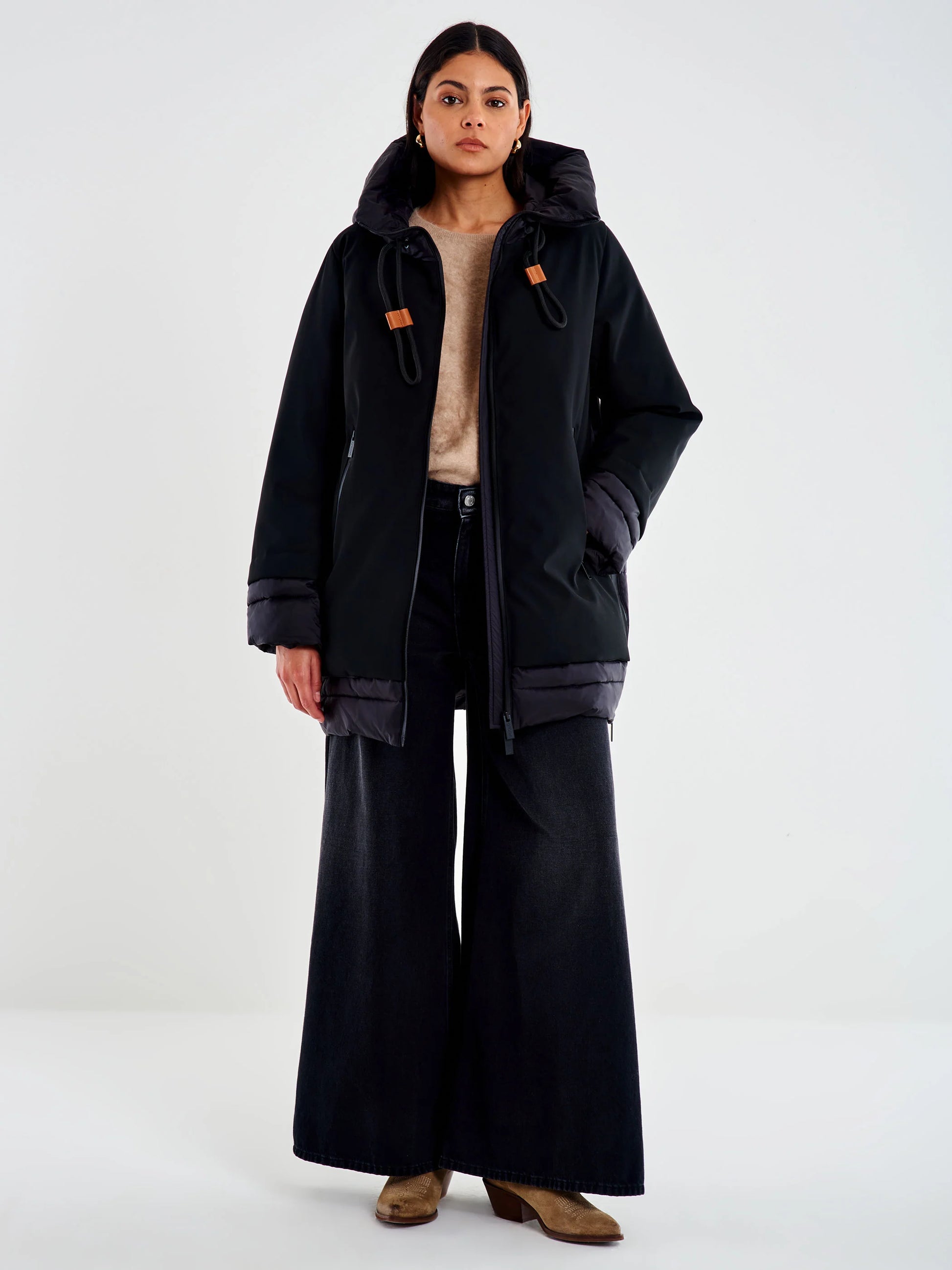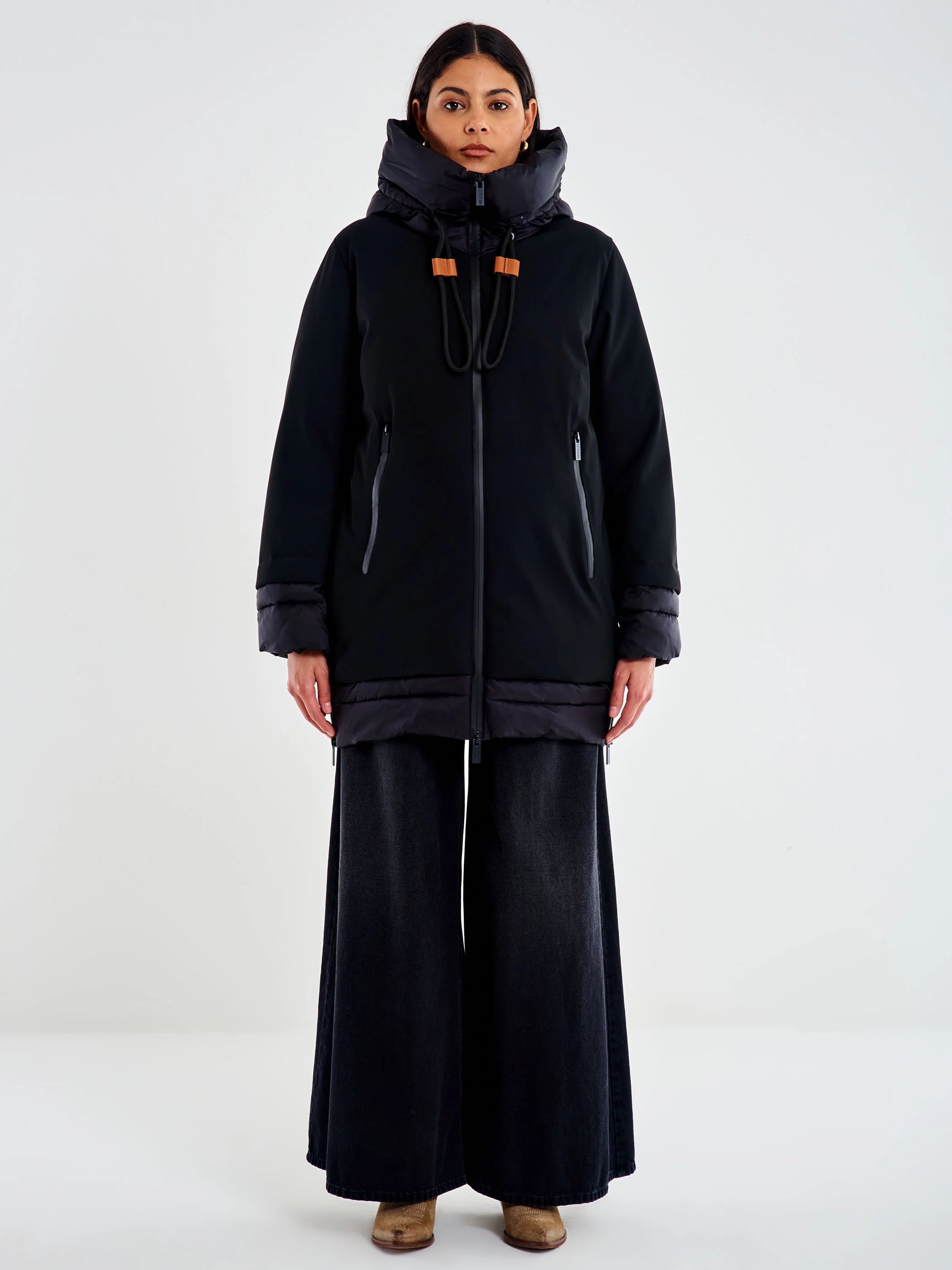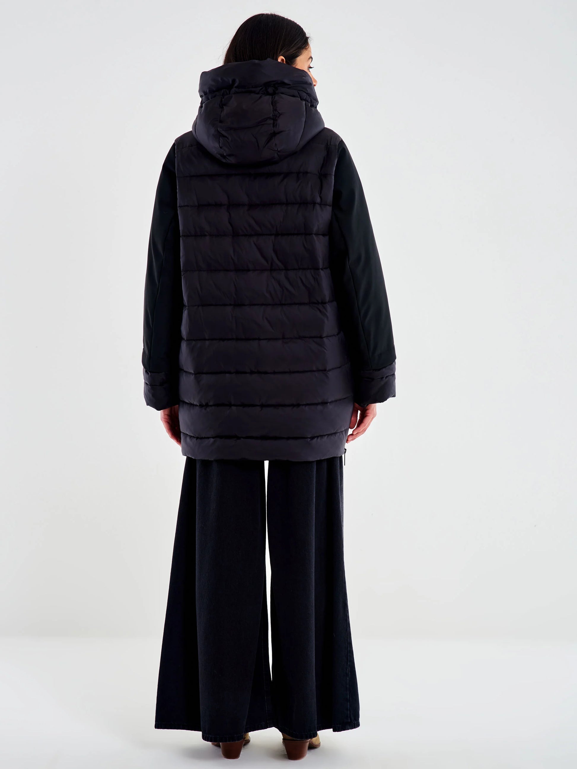 Piumino midi, modello ad uovo maniche lunghe con cappuccio. Imbottito combinato con tessuto tecnico. Chiusura frontale con cerniera. Tasche alla francese con zip. Cappuccio con piumino con corda. Zip laterali che permettono di espandere il piumino. Vestibilità over.