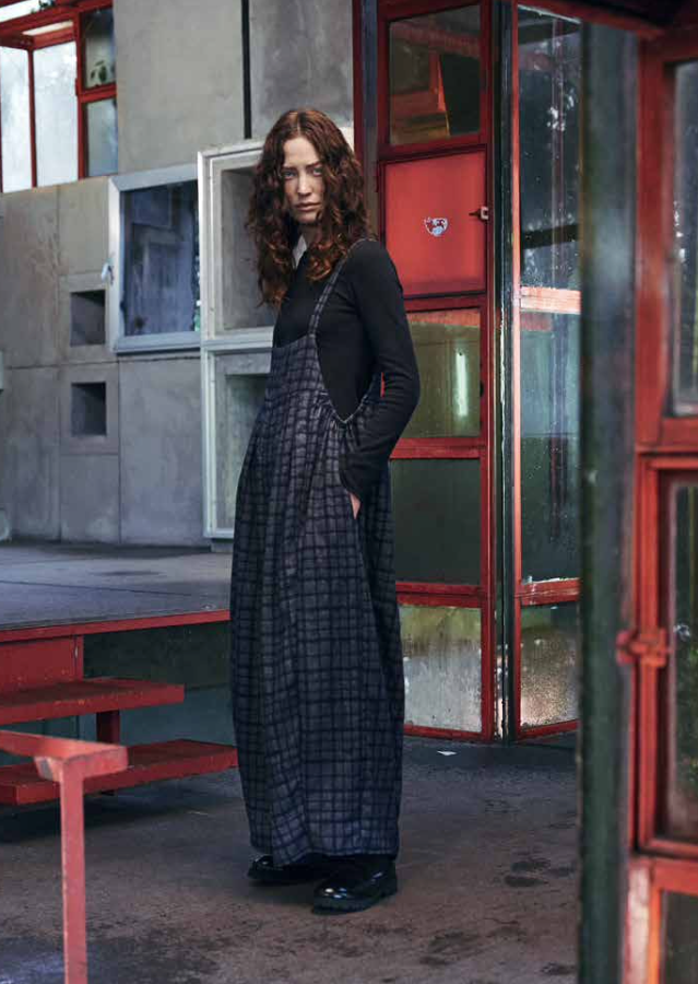 Salopette morbida in cotone, ampio scollo sotto le maniche, modello con bretelline. Pantalone a gamba ampia, vestibilità morbida e svasata.