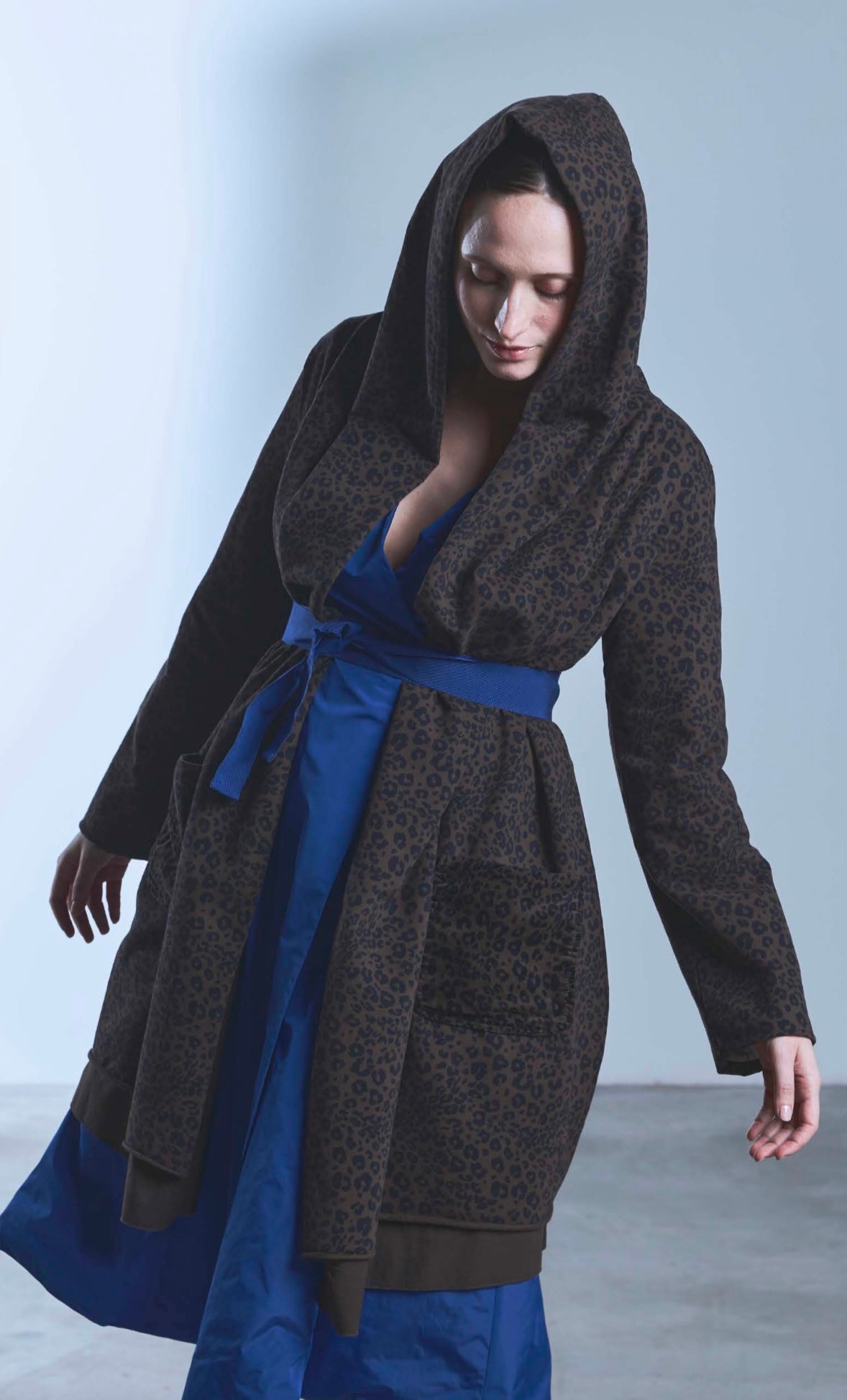 Spolvero lungo in cotone con cappuccio e cintura animalier TreBarraBi. Lunghezze asimmetriche, senza bottoni e tasche sul davanti.