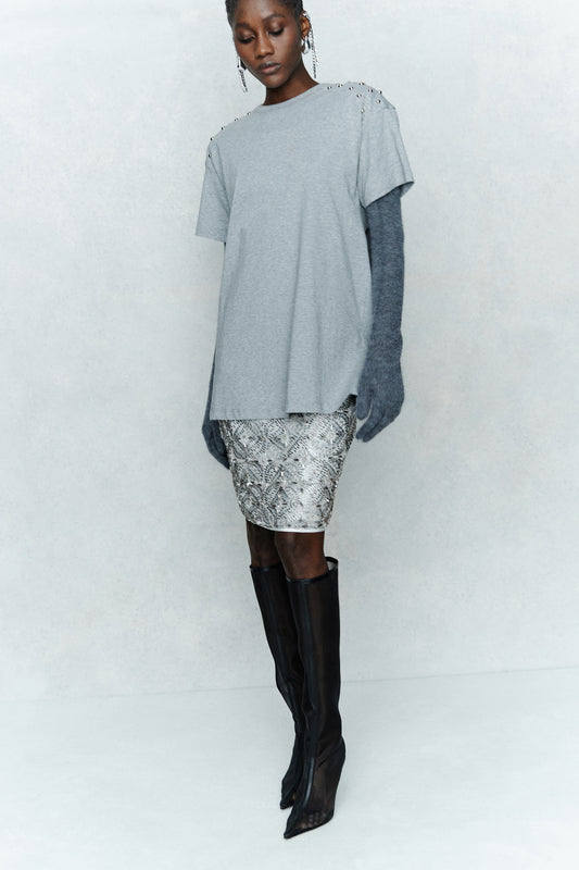 T-shirt lunga mezza manica con borchie argento sulle spalle. Vestibilità regolare.