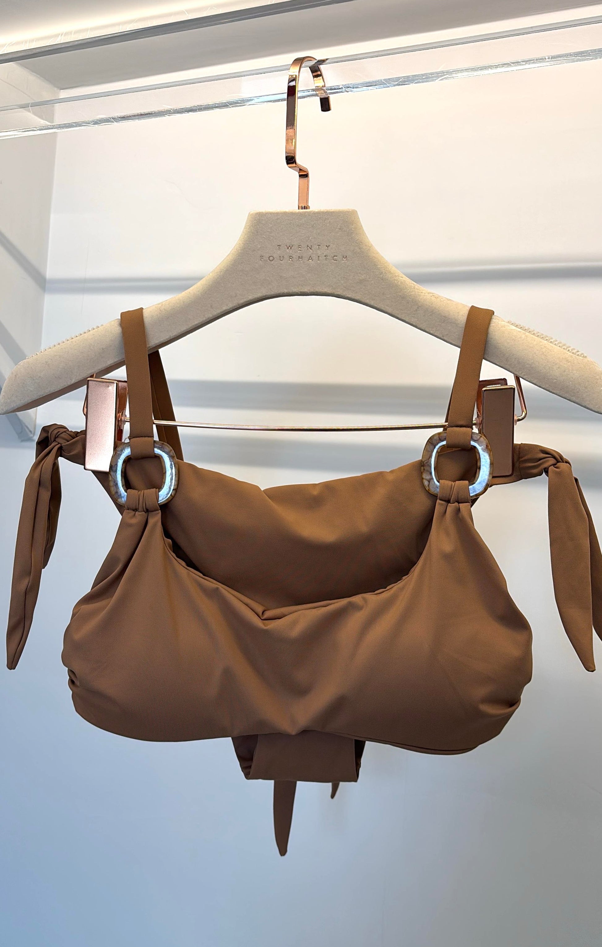 Costume a brassiere con doppio anello e chiusura con fiocco dietro. Può essere abbinato allo slip della stessa serie.