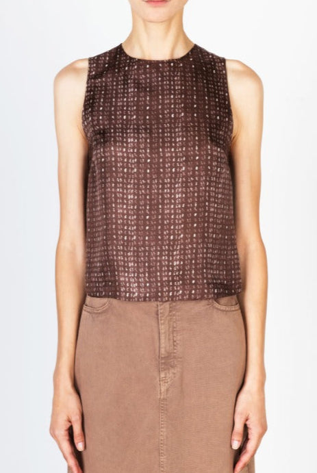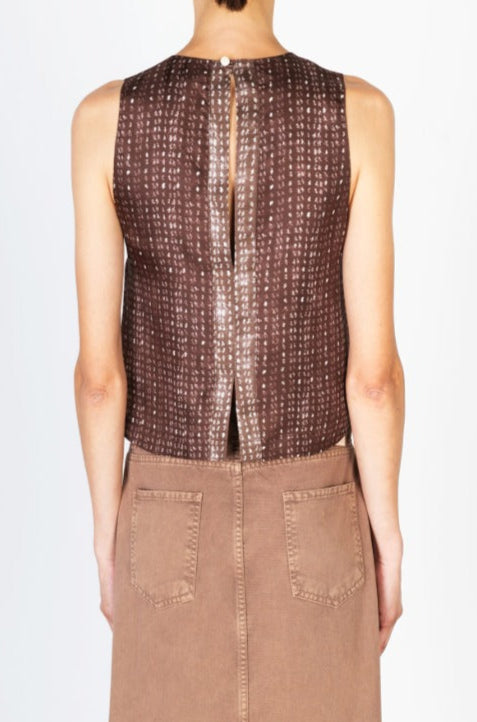 Top in seta con fantasia stampata all-over, apertura sul retro con bottoncini. Scollo rotondo, vestibilità normale.