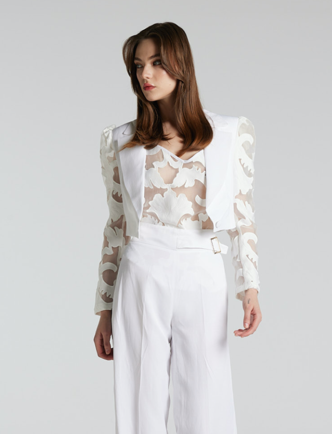 Top a manica lunga con dettagli di trasparenze e disegni all-over. Scollo a V arrotondato, vestibilità normale.