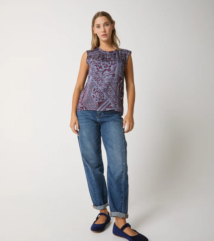 Top realizzato in raso di viscosa con stampa all over e dalla texture leggera e fluida. Versatile e ricercato dal twist boho-chic, il modello ha una linea dritta e rilassata con collo a giro. Vestibilità normale, leggermente ampia.