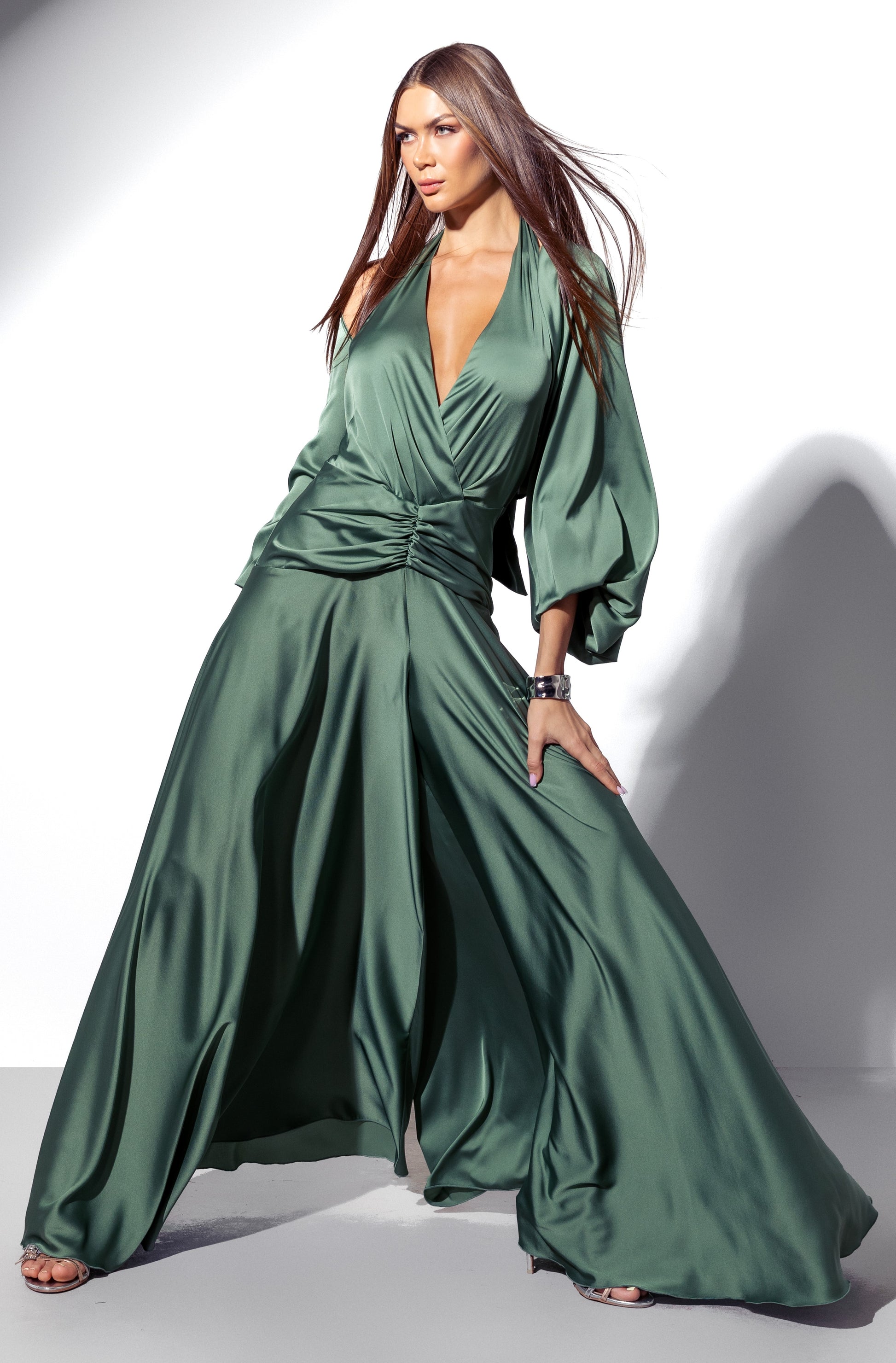 Tuta ampia con scollo americana, profondo scollo a V, schiena scoperta. Fascia in vita drappeggiata. Vestibilità regolare.