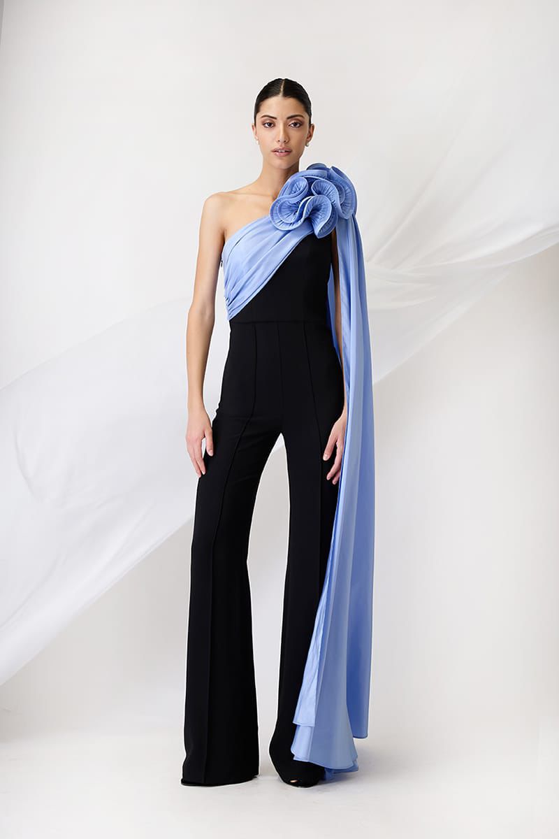 Tuta modello aderente, dettaglio della fascia e del drappeggio tipo strascico sul retro con fiori lavorati ed applicati sulla spalla.